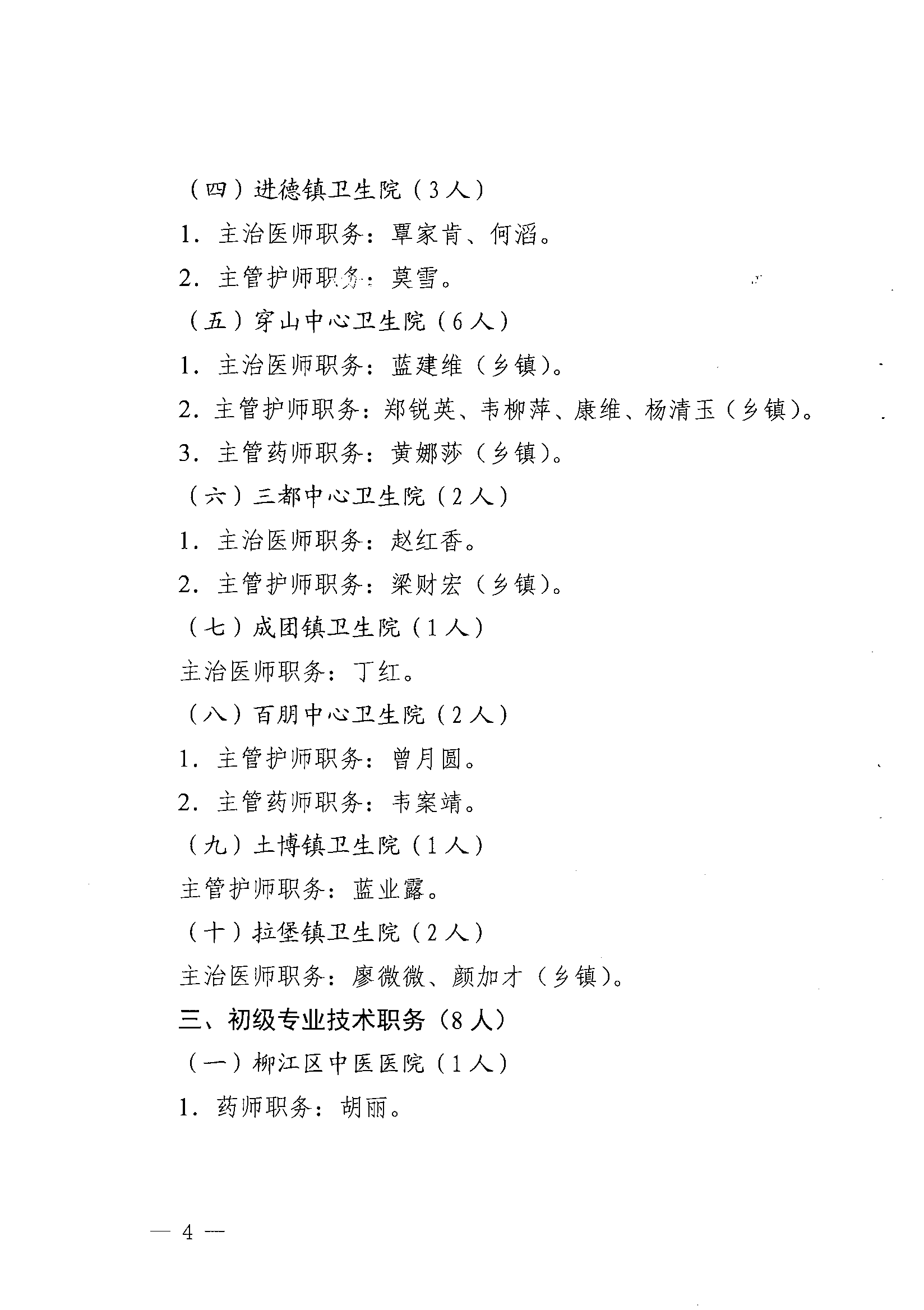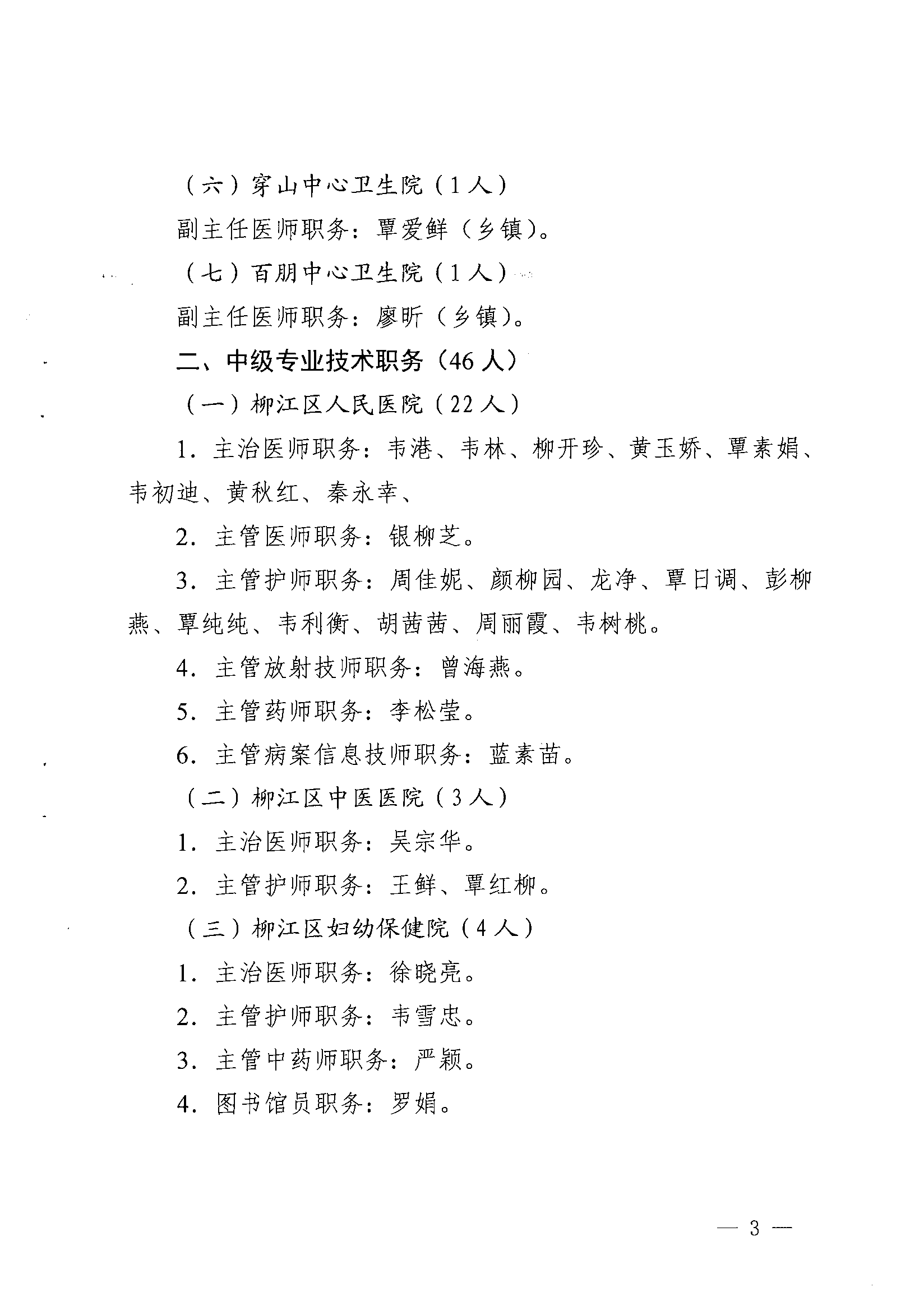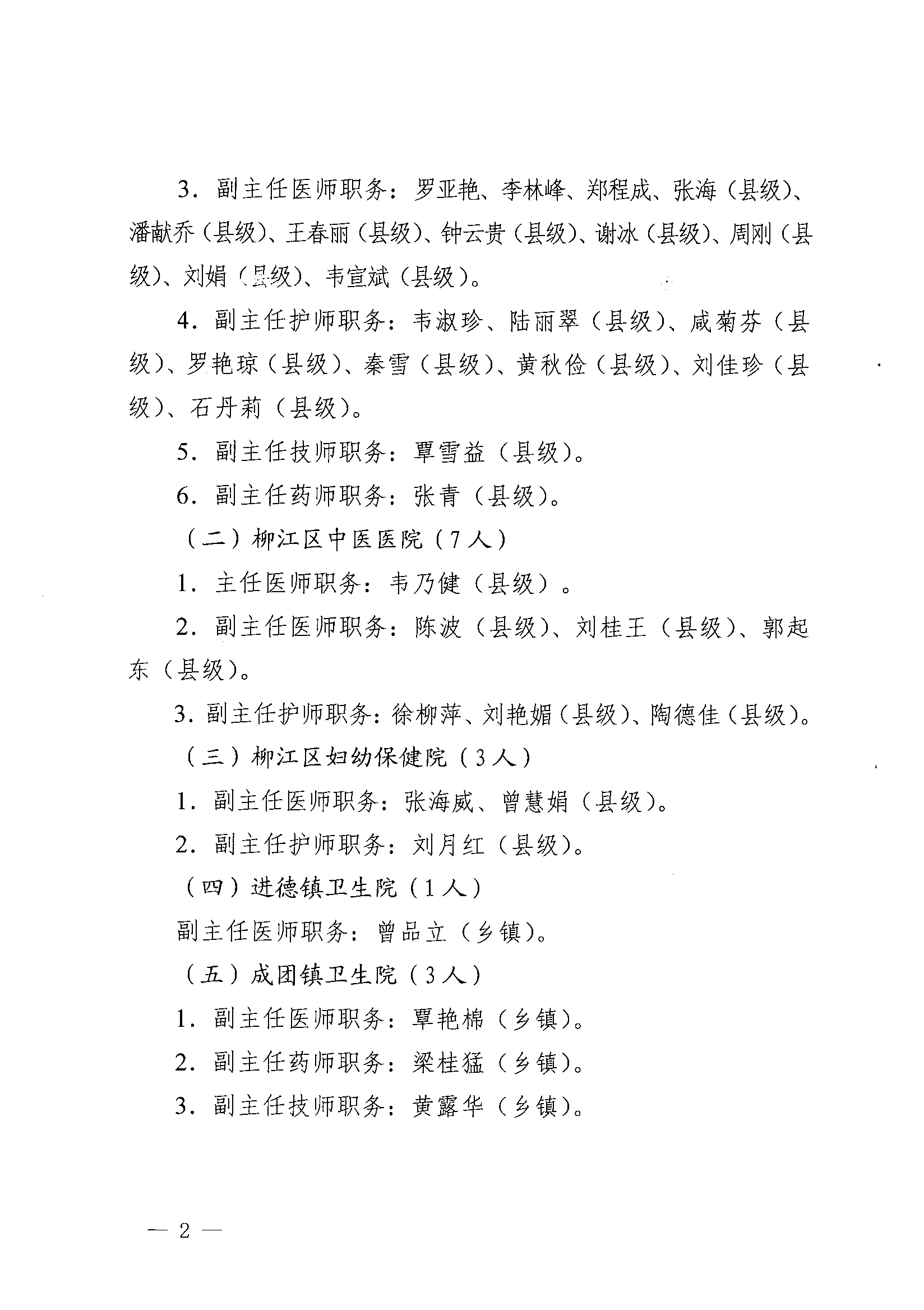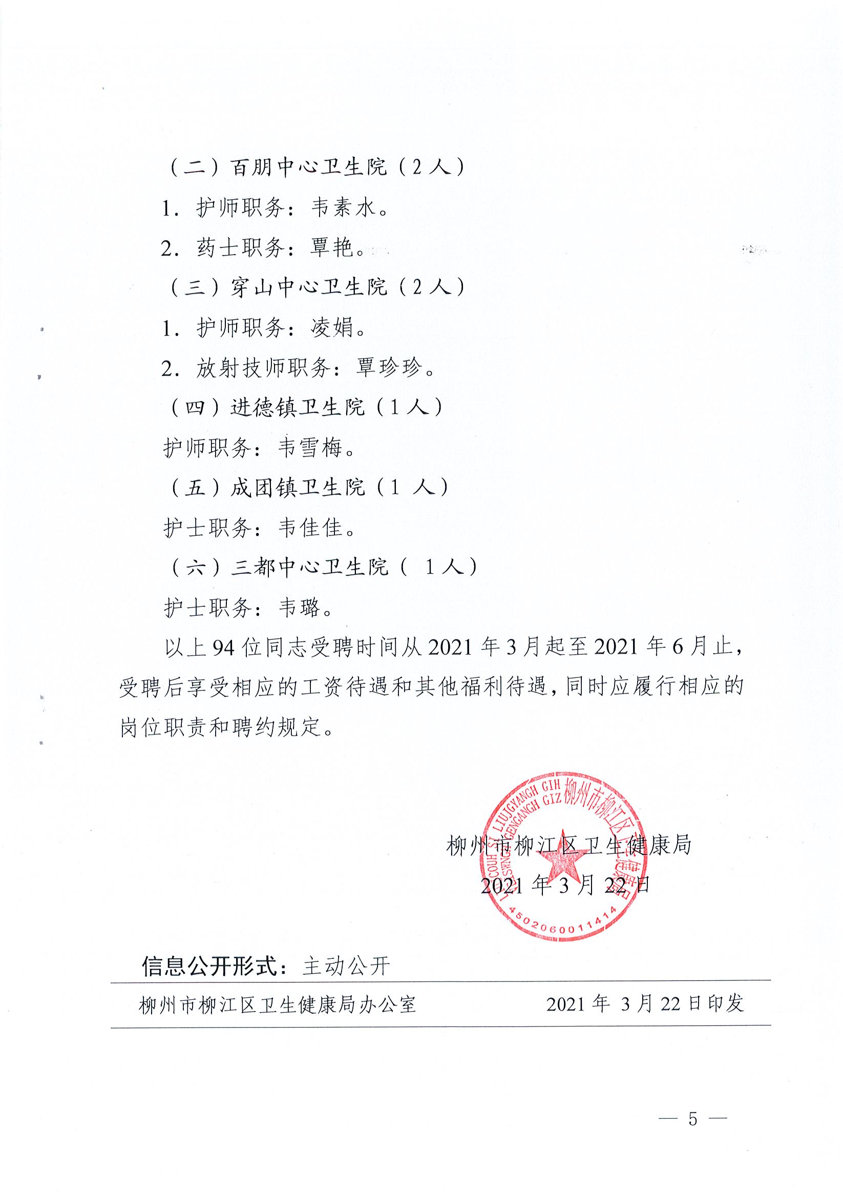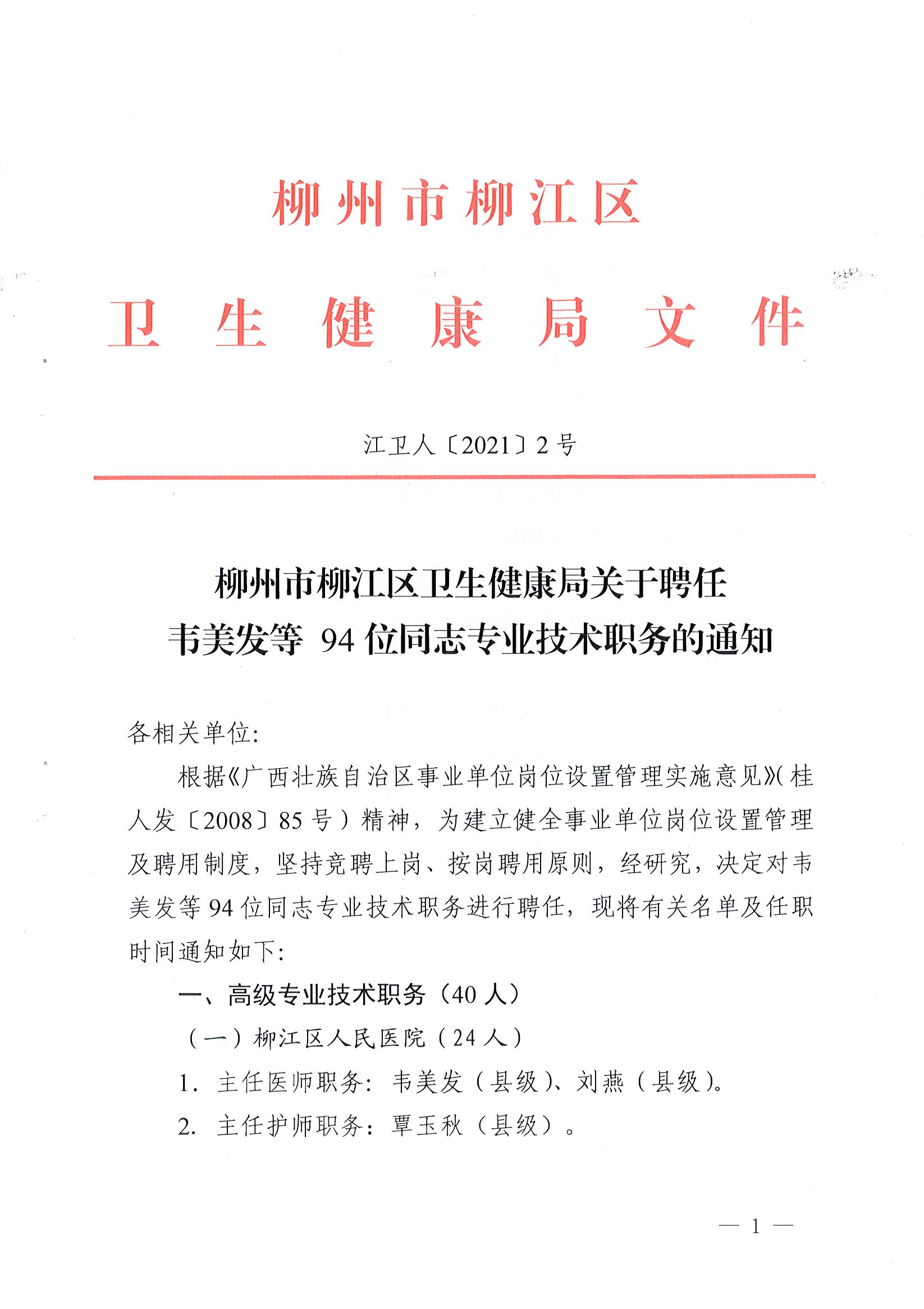 江卫人〔2021〕2号 柳州市柳江区卫生健康局关于聘任韦美发等 94位同志专业技术职务的通知
