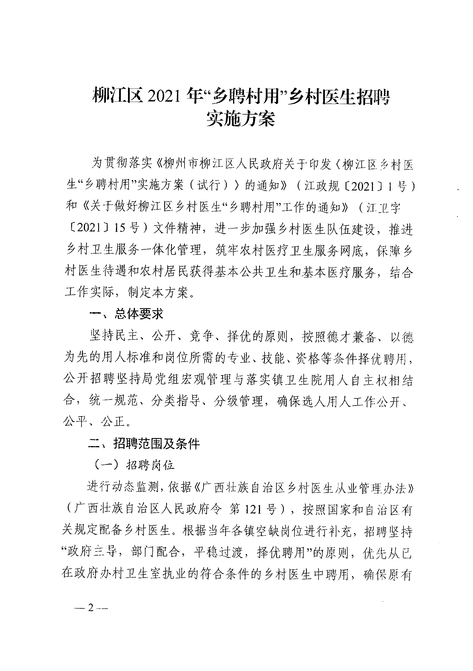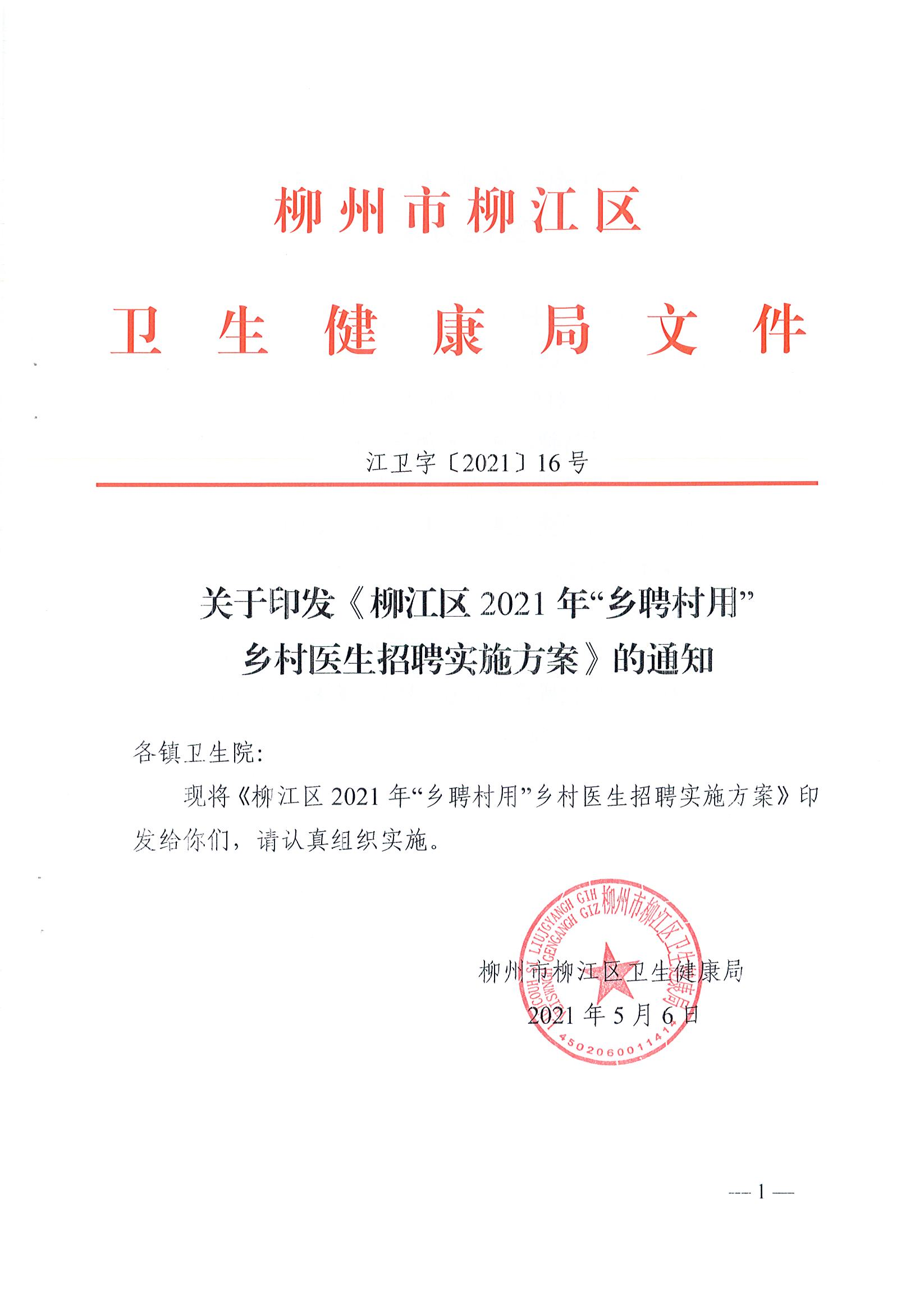 江卫字〔2021〕16号 关于印发《柳江区2021年“乡聘村用”乡村医生招聘实施方案》的通知