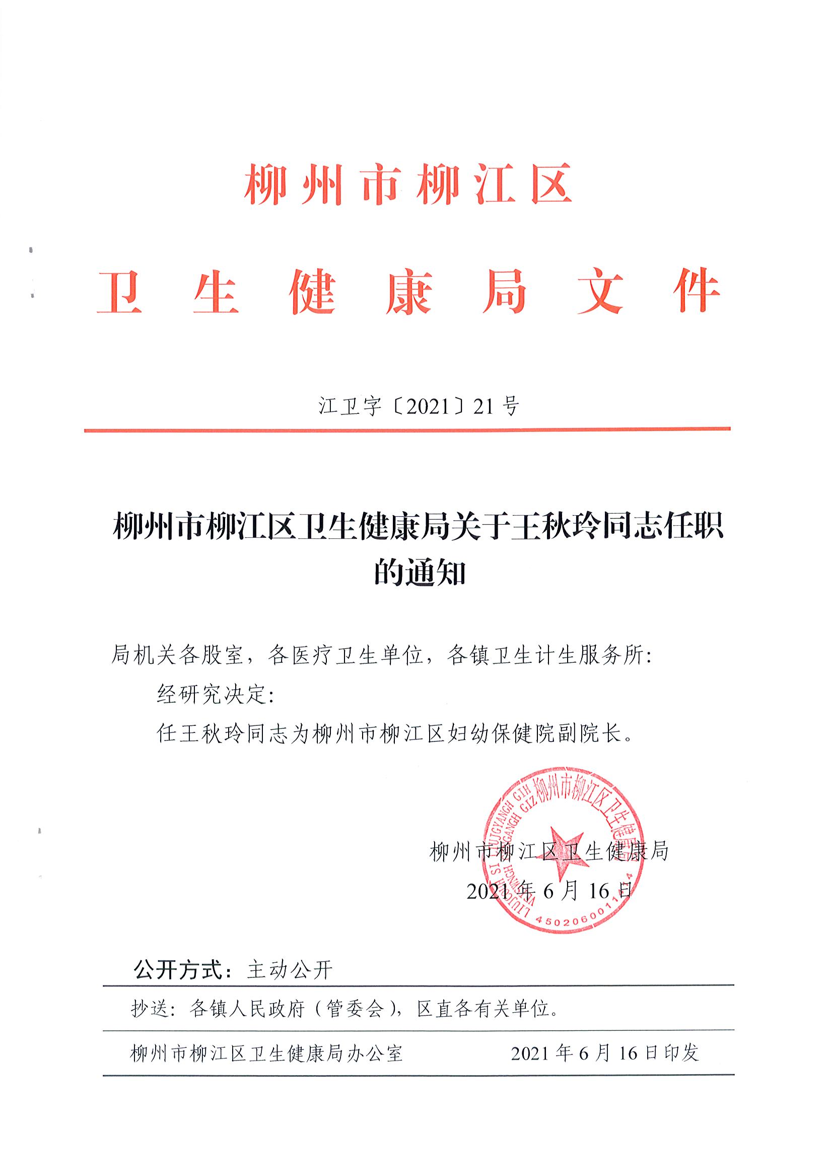 江卫字〔2021〕21号 柳州市柳江区卫生健康局关于王秋玲同志任职的通知