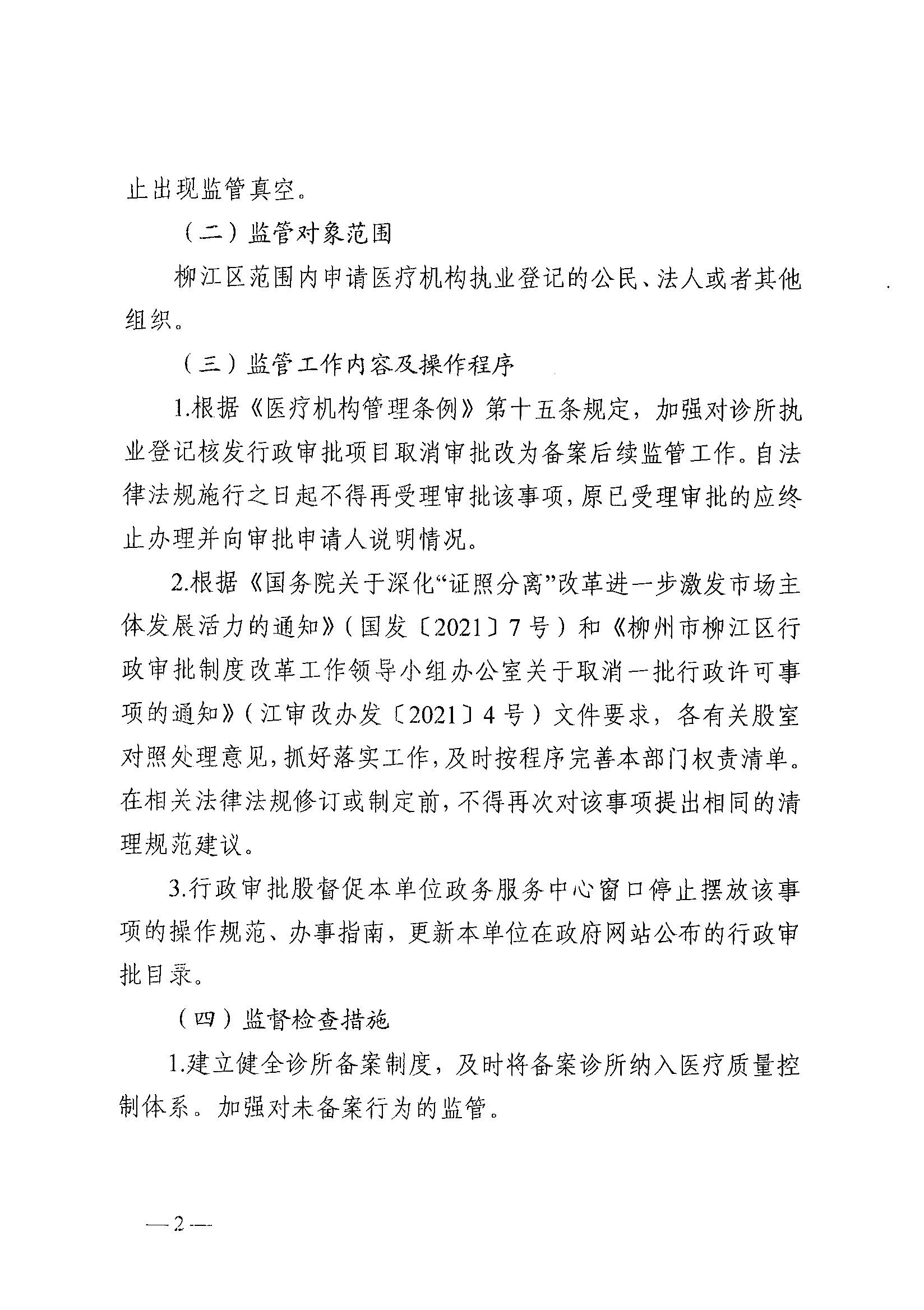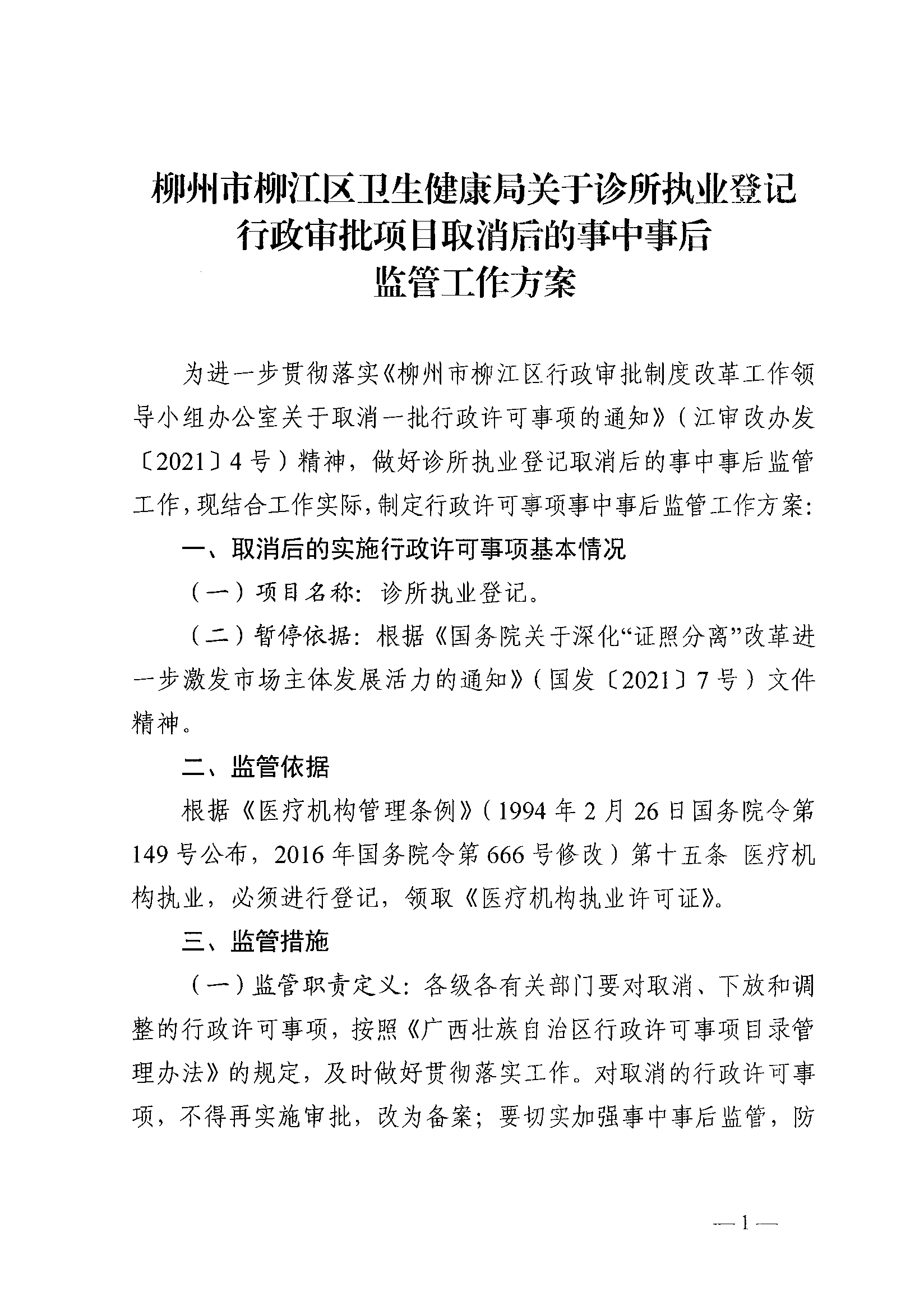 柳州市柳江区卫生健康局关于诊所执业登记行政审批项目取消后的事中事后监管工作方案
