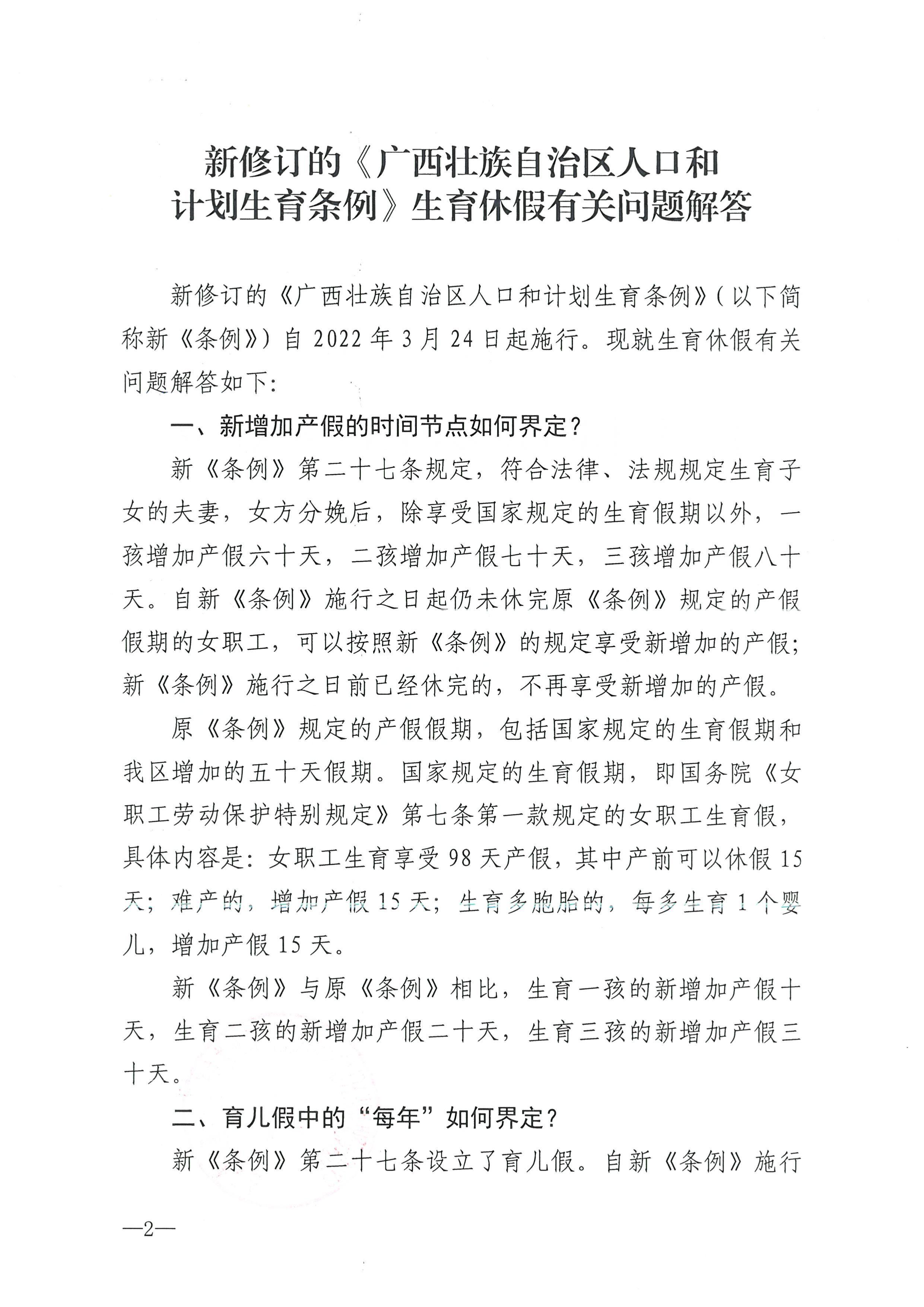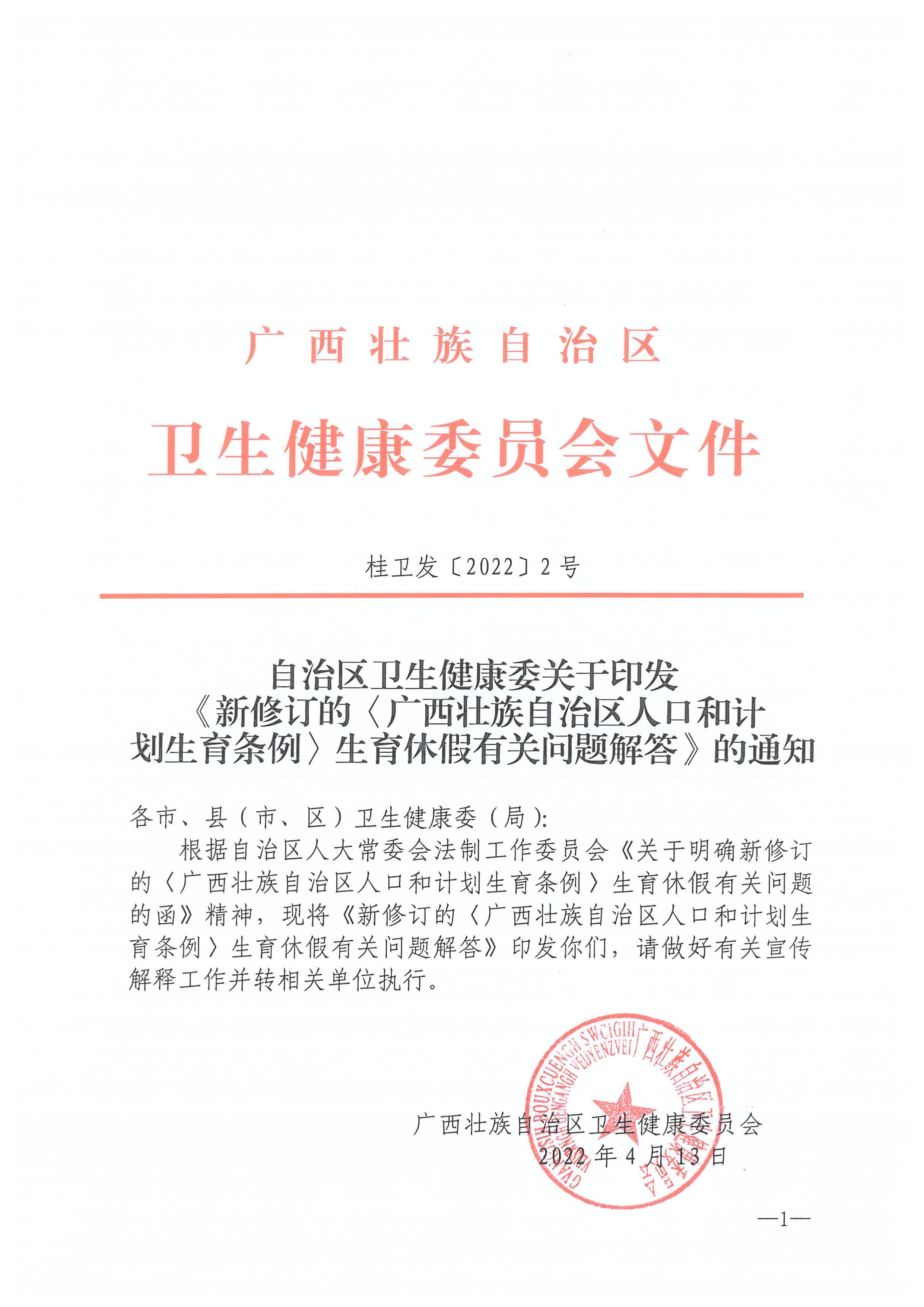 自治区卫生健康委关于印发《新修订的广西壮族自治区人口和计划生育条例生育休假有关问题解答》的通知