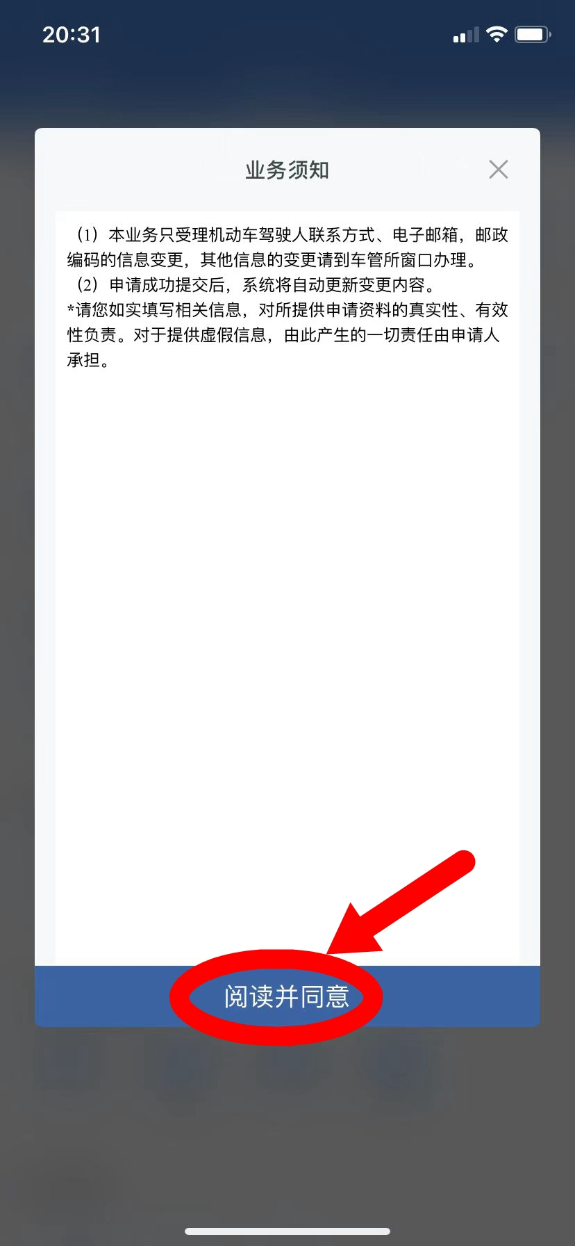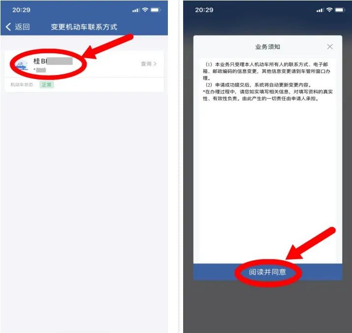 2、选择变更联系方式的车辆→进入阅读【业务须知】,认真阅读后,点击【阅读并同意】,进入下一步;