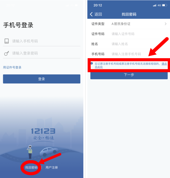 1、在登录“交管12123”手机APP首页,点击【找回密码】,点击【忘记原注册手机号码或原注册手机号码无法收短信】;
