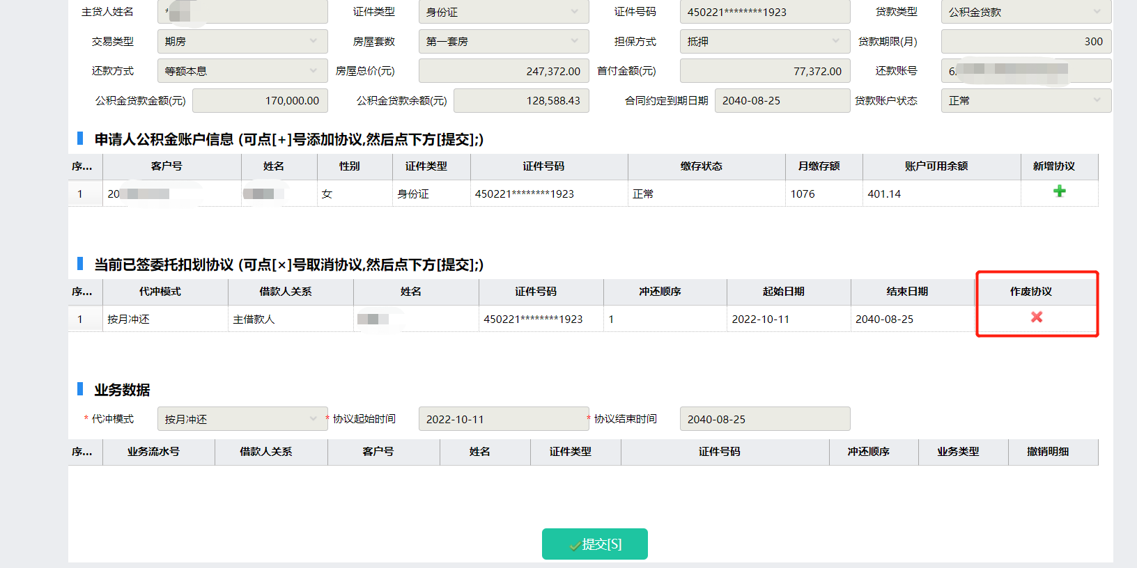 4.选择申请人对应的公积金账户信息,点击作废协议“×”保存至冲还贷业务数据列表。