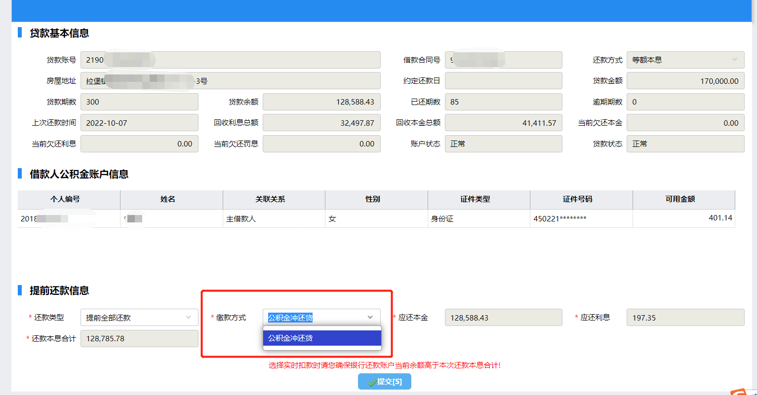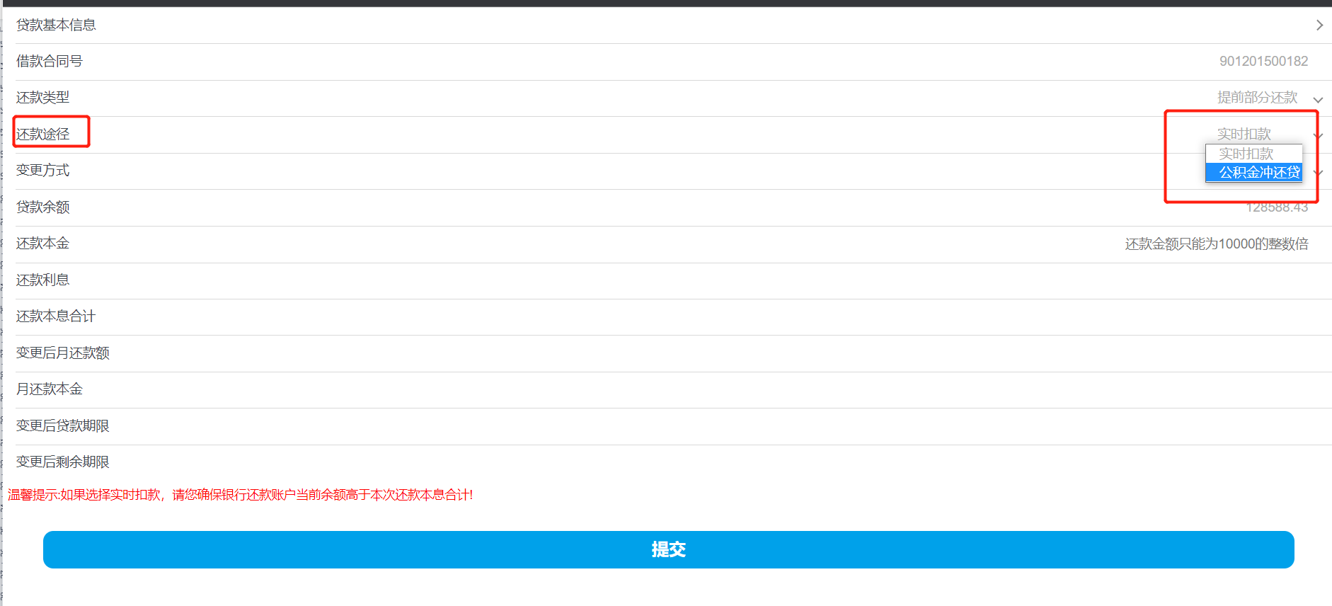 2.点击提前还款,进入到办理界面,还款途径选择“公积金冲还贷”。