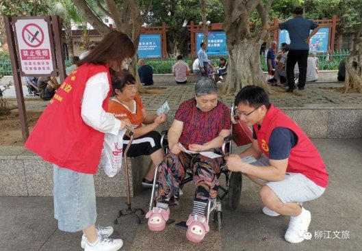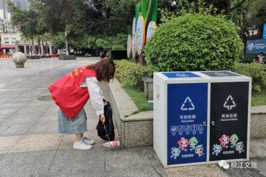 志愿者们手拿垃圾袋和钳子清除掉落在地上的垃圾,向周围群众发放生活垃圾分类投放指南和知识普及手册,号召大家主动了解并自觉参与到垃圾分类行动中,携手共建美丽柳江。