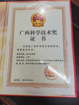 6月30日,柳江区糖业发展服务中心下属二层机构柳江区甘蔗技术推广站与广西壮族自治区农业科学院、广西凤糖生化股份有限公司、来宾市兴宾区甘蔗技术推广站、百色市经济作物栽培技术推广站共同研究的种茎直接补种延长宿根年限技术创新及应用成果,喜获广西壮族自治区人民政府2022年度广西科学技术奖励三等奖。