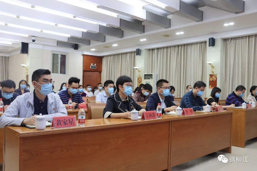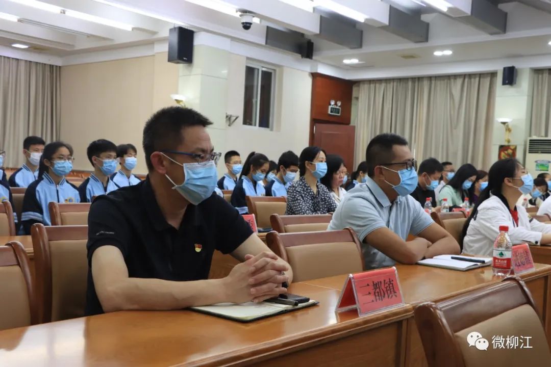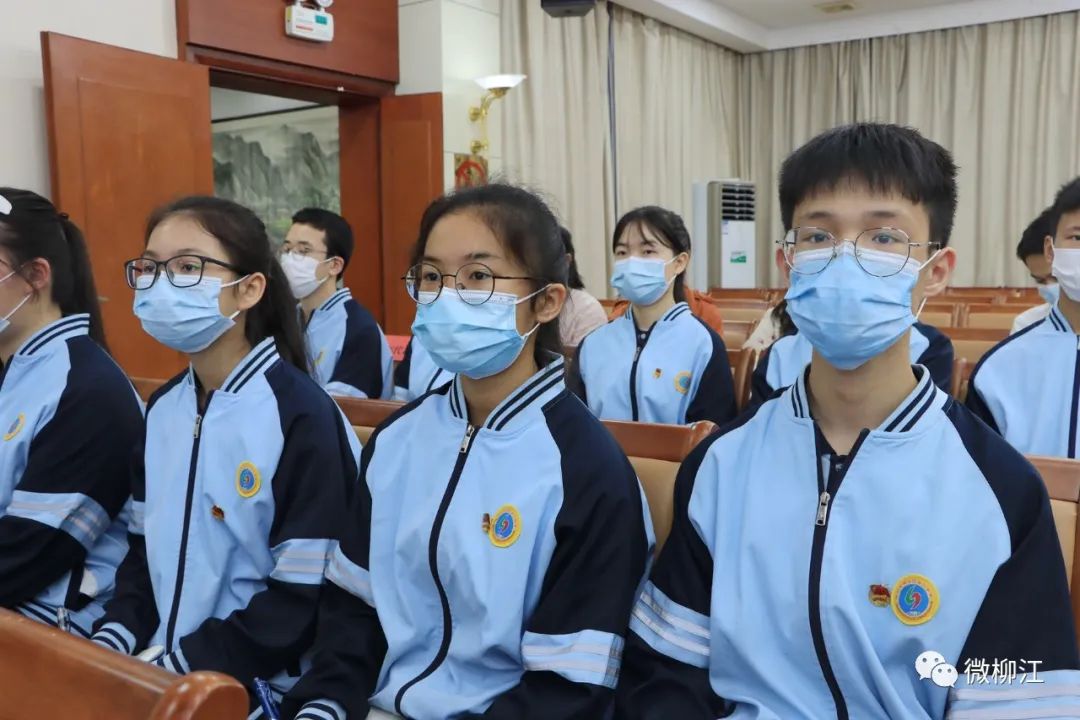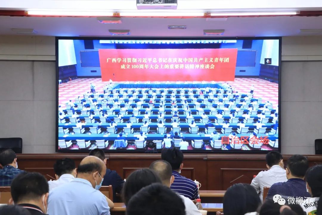 柳江区领导玉秋静、李华、黄家星、李培绿、刘世刚、黄馨、梁山、韦斌忠、计荣萍等,及优秀青少年代表在柳江分会场收听收看电视电话会议。