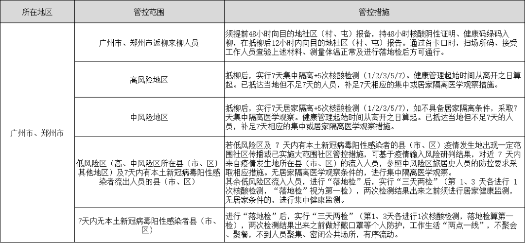 对入境人员严格实行 7 天集中隔离医学观察(在集中隔离第 1、2、3、5、7天各进行 1 次核酸检测)+3 天居家健康监测(第 3 天进行 1 次核酸检测)。香港,台湾地区人员入柳参照入境人员管控,统一按入境人员进行健康管理,即7 天集中隔离医学观察(在集中隔离第 1、2、3、5、7天各进行 1 次核酸检测)+3 天居家健康监测(第 3 天进行 1 次核酸检测)。
