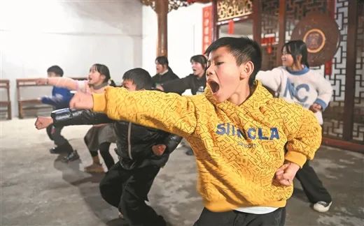 “前弓步交叉,高狮,右抬头,甩回,左抬头!”每到周末和寒暑假,木岸屯里就响起了密集的锣鼓声,孩童稚嫩的“哼哈”练武声。