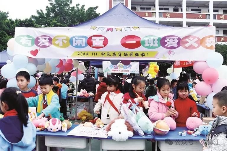 活动现场热闹非凡,人头攒动。同学们将“爱心能量卡”贴满心愿墙,开展义务包书膜、修笔等活动。在“雷锋红领巾集市”上,各个摊位整齐摆放着商品,同学们化身“小掌柜”“小顾客”积极参与义卖活动。