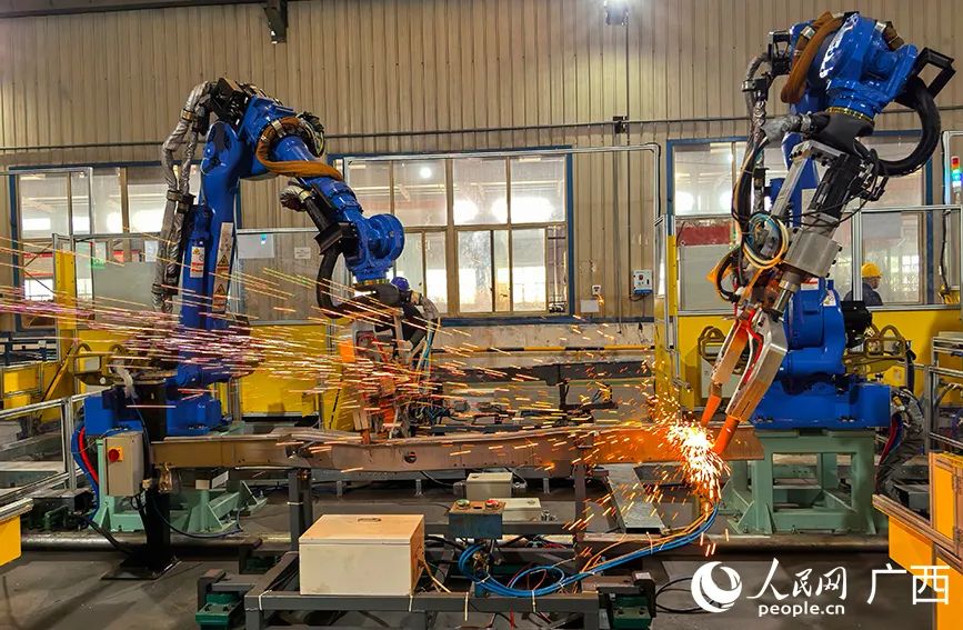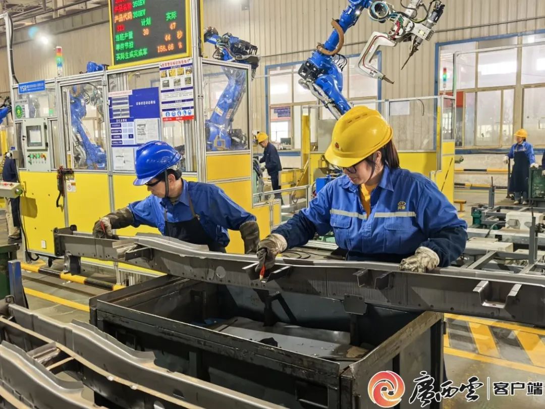 机械臂精准抓取钣金件,激光焊接火花四溅……走进位于柳江区新兴工业园的柳州市宸泰机械有限责任公司(以下简称“宸泰机械”)生产车间,自动化的冲压生产线和焊接机器人生产线正在高效运转,车间工人整齐有序地将零件检验装车。作为上汽通用五菱的一级供应商,该企业的产品以冲压件、焊合件为主,在2024年实现了产值2.56亿元,同比增长63.13%;今年1—2月产值3292万元,同比增长29.56%。宸泰机械管理部部长李丽红表示,通过引入机器人生产线,企业不仅缩短了制造周期,还提升了产品技术含量和附加值。