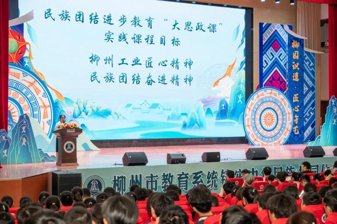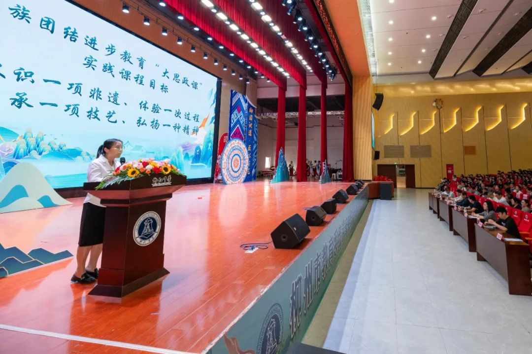 柳江中学“柳园‘识’遗 匠心守艺”“大思政课”实践课程展示,是本次活动重头戏之一。一个个动人故事的分享,一个个精彩的非遗表演、一堂堂生动的非遗课堂、一项项有趣的民族传统体育等,让柳江中学高一、高二的4000多名师生了解非遗、感受非遗、体验非遗,在与非遗“撞个满怀”中,实现“认识一项非遗、体验一次过程、传承一项技艺、弘扬一种精神”。