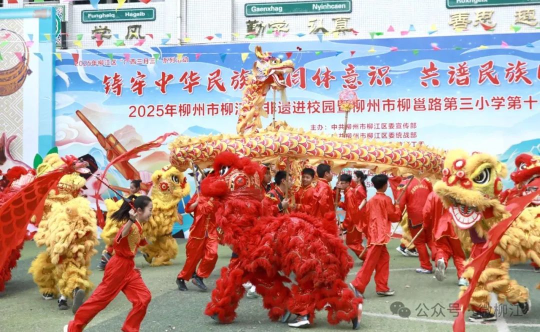 连日来,柳江区各中小学陆续举办以“三月三”为主题的节庆活动。在柳江中学,高杆狮表演《醒狮铸华魂》、舞蹈《狮舞青春》、石琴演奏《采茶姐妹上茶山》等节目轮番上演,板鞋竞速、竞技龙比拼、背篓接绣球等运动项目精彩比拼;在柳邕路第三小学,同学们用精彩的舞龙表演,喜迎“三月三”;在柳江区壮语文学校附属小学,《又见刘三姐》《石榴花开三月三》《壮歌不唱不快活》等山歌对唱,让孩子们在歌声中感受民族节庆氛围,展现壮乡儿女的热情与活力;在柳江区机关幼儿园,悠扬的小提琴声、欢快的竹竿舞展现非遗魅力,小朋友们共同制作五色糯米饭、抛绣球、舞龙狮,体验丰富多彩的民俗风情。