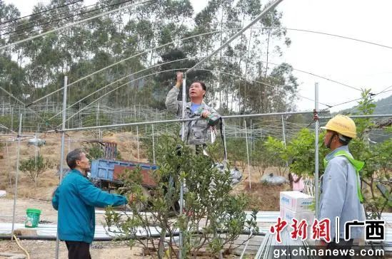 4月7日,走进基地,只见山坡上绿意盎然,成排的钢架整齐排列。工人们分工明确,有的检查钢架结构,有的搬运维修材料,有的调整加固,现场忙碌而有序。“这些钢架棚是金桔树‘保护伞’,既能遮风挡雨,又可调节果园内的‘小气候’。”甘贡村党总支部书记韦柳平介绍道,趁着农闲,村民们抓紧时间加固钢架,确保金桔生长关键期能有良好的外部环境,从而实现优质高产。
