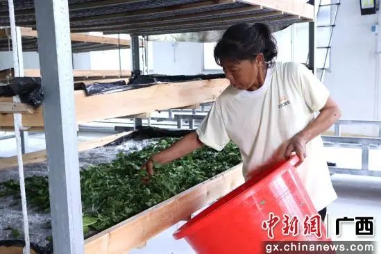5月8日,位于里高镇三合村弄麦屯的广西蚕宗农业发展有限公司桑蚕养殖基地里,一排排竹制蚕匾整齐码放,嫩绿的桑叶铺满匾底,幼蚕正蠕动着身躯啃食桑叶。蚕农黄华英手法娴熟地将新鲜桑叶撕成碎片,均匀地撒在蚕匾中,为幼蚕提供丰富的食料。