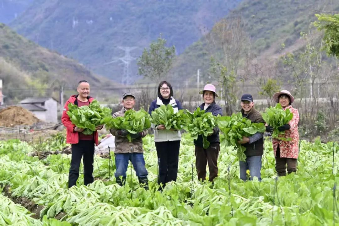 广西壮族自治区柳州市柳江区三都镇白见村板朝屯,颜茜茜(左三)、父亲颜建条(左一)和村民们展示刚刚采摘的芥菜。2021年,颜茜茜回到家乡创业,和父亲成立了农业公司,发展竹笋和蔬菜的种植、腌制产业,带动村民就业增收。