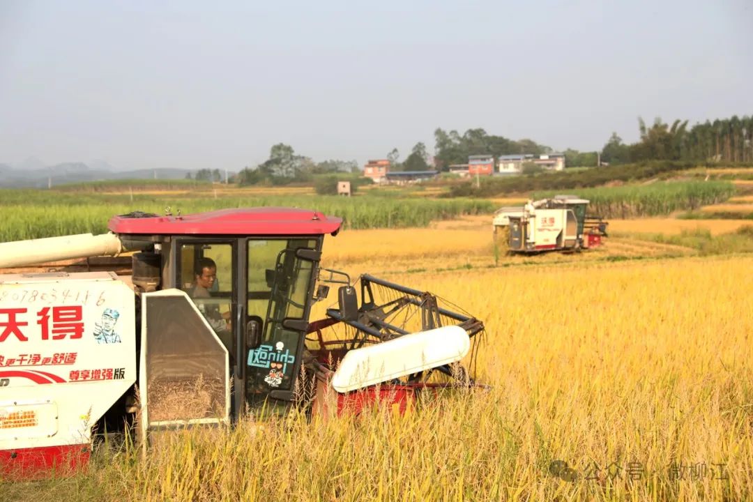 柳州市晴耕农机专业合作社机械化收割水稻。