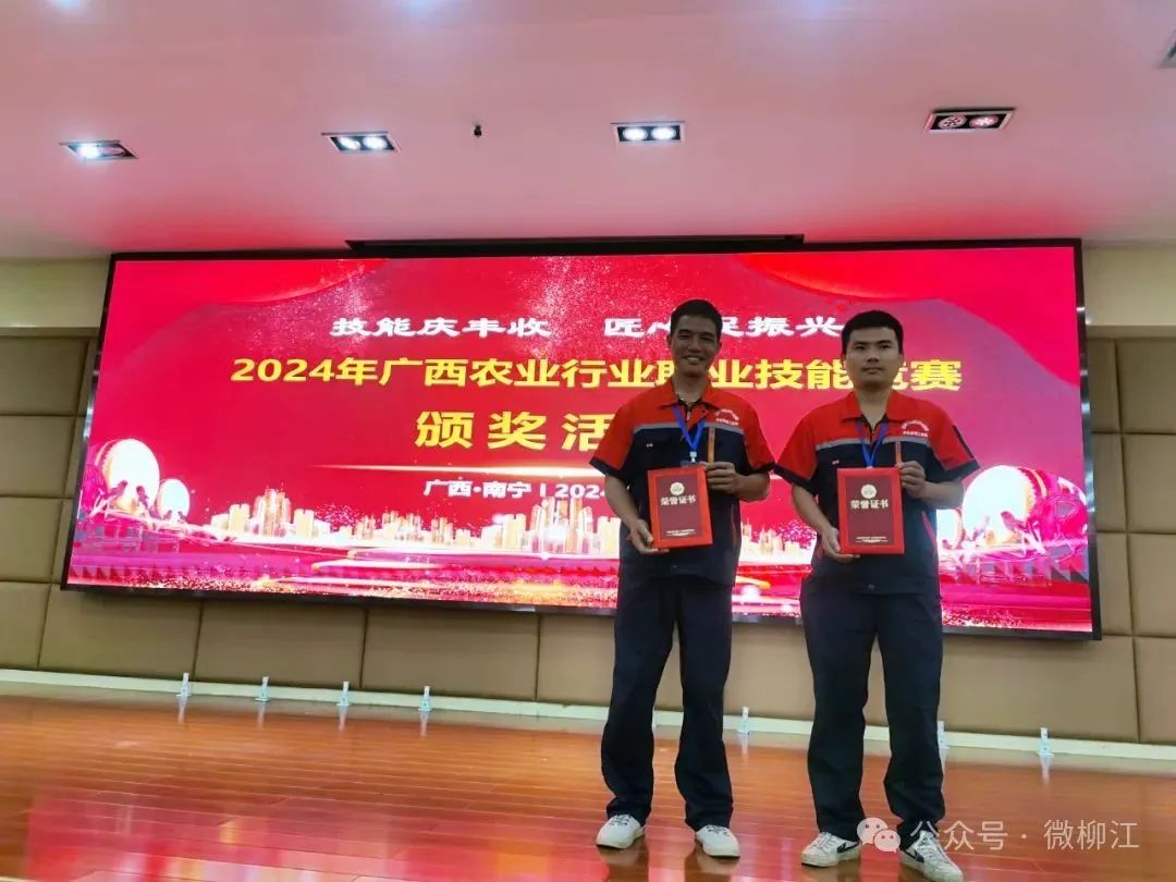 姚仁起(左)获评“广西技术能手”荣誉称号。