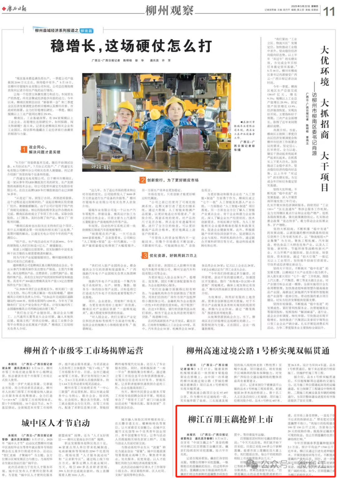 百朋镇玉藕的清甜、里高镇蚕茧的莹润、穿山镇辣椒的火红、进德镇嘉宝果的醇香、土博镇蓝莓的馥郁,在媒体镜头下汇成绚丽画卷,不仅呈现柳江农业丰收盛景,更彰显乡村振兴斐然成就。相关重点稿件让我们一起回顾。