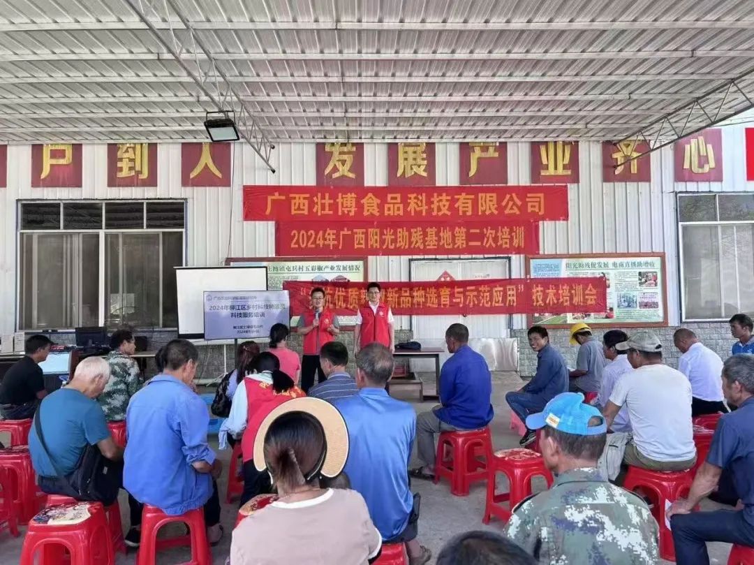 2023年,广西壮博食品科技有限公司与柳江区残疾人联合会携手共建广西阳光助残基地,帮扶土博镇120户残疾人家庭种植五彩椒。公司为残疾人家庭免费提供五彩椒苗、肥料、地膜等生产物资,定期邀请专家开展种植培训,手把手传授种植技术。助残基地成立以来,共开展10期五彩椒种植技术培训,受众500余人次。“以前种植五彩椒全凭经验,收成差、卖不上价,心里头直犯愁。”种植户覃相贤说,“多亏了韦锦东!不仅免费送来种苗和肥料,还带着专家手把手教技术。最让我们踏实的是,他承诺保底收购,再也不用担心辛苦种出来的五彩椒烂在地里。”