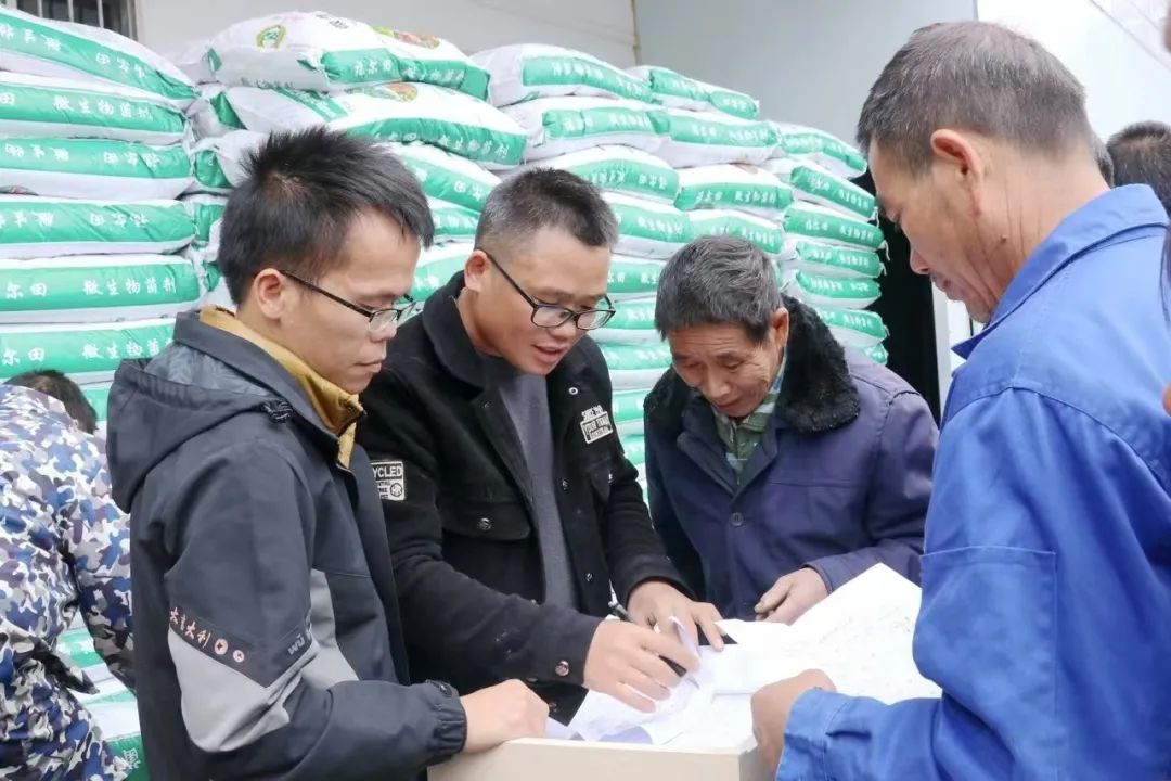 韦锦东(左二)正在给残疾人发放五彩椒生产物资。