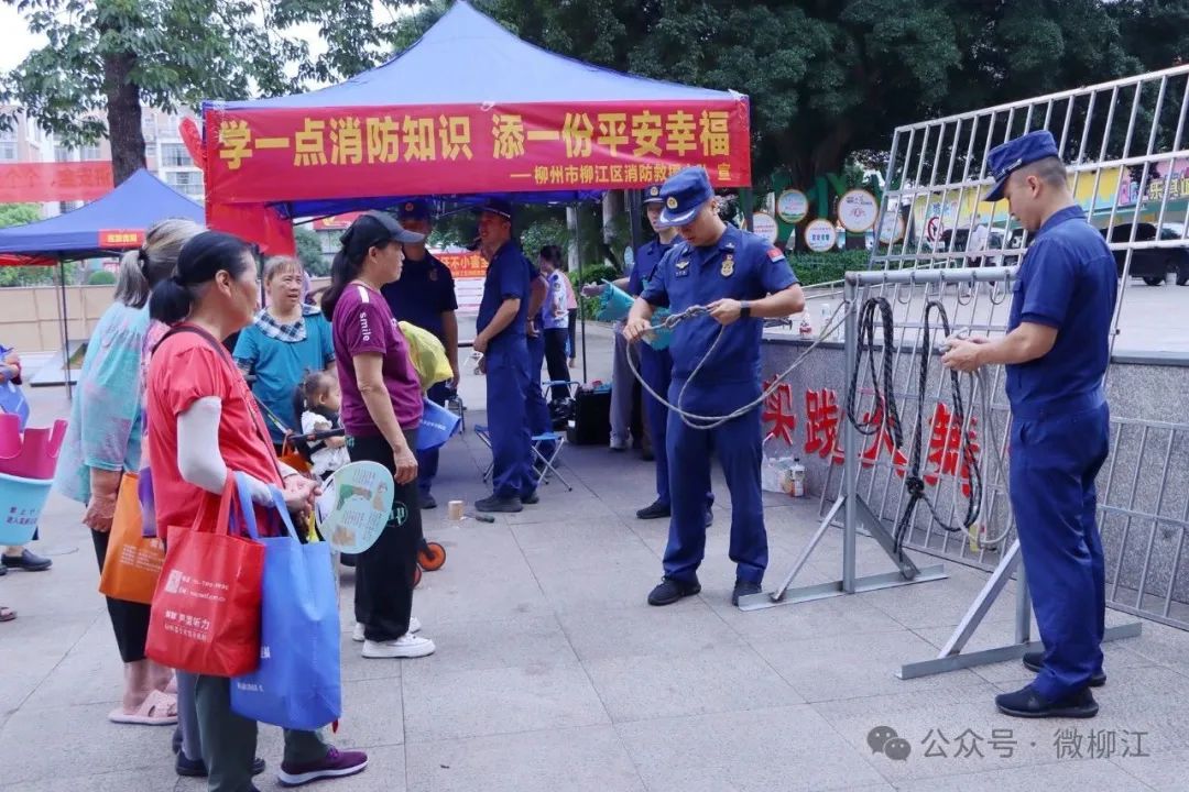 “打双平结时关键在于绕两圈,松手后拽住绳尾再拉紧,少绕一圈受力时就会松脱,绳子另一端要固定在承重物上,打好‘死结’。”柳江区消防救援大队柳堡消防救援站副政治指导员朱恩豪一边讲解,一边演示常用消防绳结的打法,吸引众多群众驻足学习。