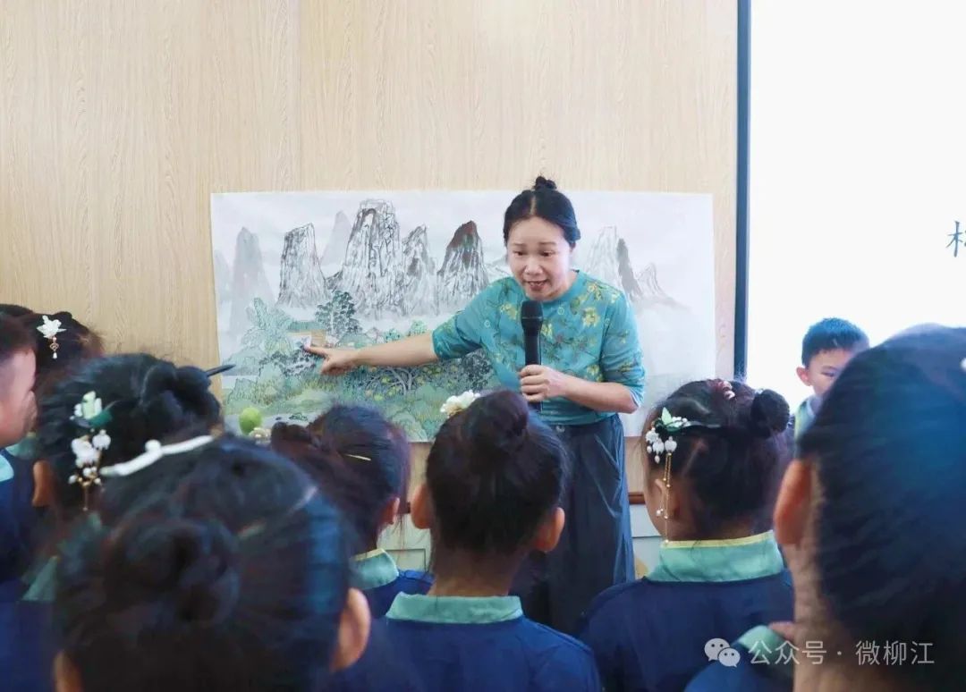 在书画展览环节,授课老师向孩子们介绍书画作品的创作背景、艺术特色以及蕴含的文化内涵。一张张稚嫩的脸庞上写满专注与兴奋,孩子们好奇地盯着国画作品,不时兴奋地指着画中的内容,惊喜地喊道:“那画里有我们的家乡!”现场气氛热烈,孩子们仿佛置身于画中世界,沉浸式地感受传统书画艺术的独特魅力。
