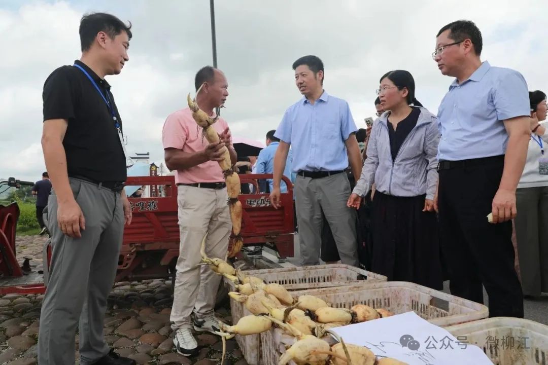 韦善用(左二)向来自全国各地水生蔬菜专技人员展示百朋玉藕。