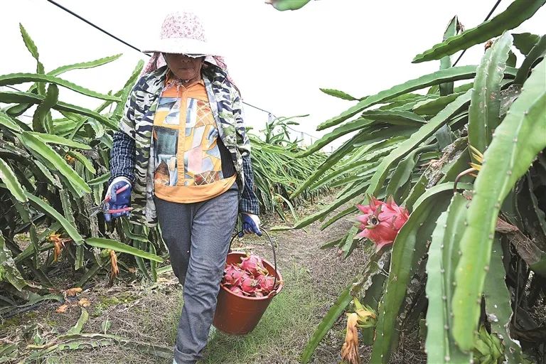 6月21日,进入夏至节气。作为盛夏的初见,夏至也寓意着农作物丰收的开端。在柳江区的田间地头,通红的火龙果、白嫩的莲藕、紫亮的茄子等果蔬陆续成熟,农民抢抓农时忙采摘,田畴沃野中呈现一派万物华实、生机盎然的景象。