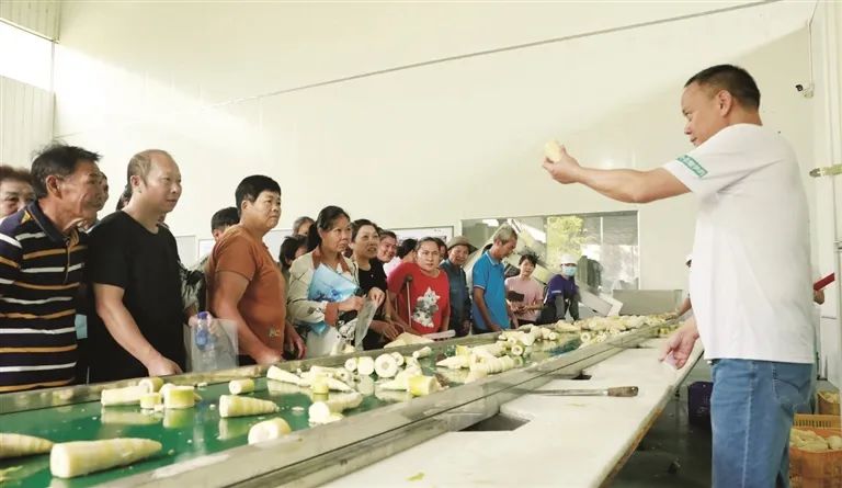 6月27日,在位于柳江区成团镇六道村的柳州笋丫头农业有限公司生产车间里,工人们忙碌地分拣、清洗新鲜竹笋,空气中弥漫着浓郁醇厚的酸香。当天上午,一场生动的“车间课堂”在此开展,柳州职业技术大学组织柳北区农村困难残疾人实用技术(竹笋种植与酸笋加工)培训班学员走进生产一线,在公司负责人的引导下,现场观摩竹笋从原料到成品的蜕变(见上图)。