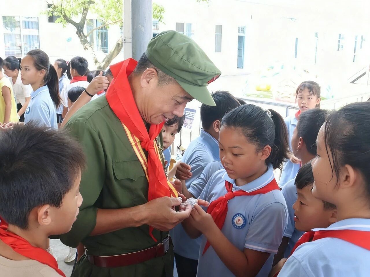 活动现场,气氛庄重而热烈。伴随着激昂旋律,少先队员们身着整齐校服,迈着铿锵有力的步伐,怀着无比崇敬的心情,郑重地为每一位参战老兵佩戴上鲜艳的红领巾。那一抹抹鲜红,不仅是对英雄前辈的崇高敬意,更是革命精神代代相传的象征。孩子们以标准而庄严的队礼,向这些用青春和热血捍卫国家主权与领土完整的英雄们致以最诚挚问候。