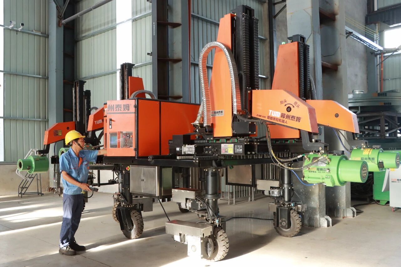 柳州泰姆预应力机械有限公司操作智能张拉机器人。