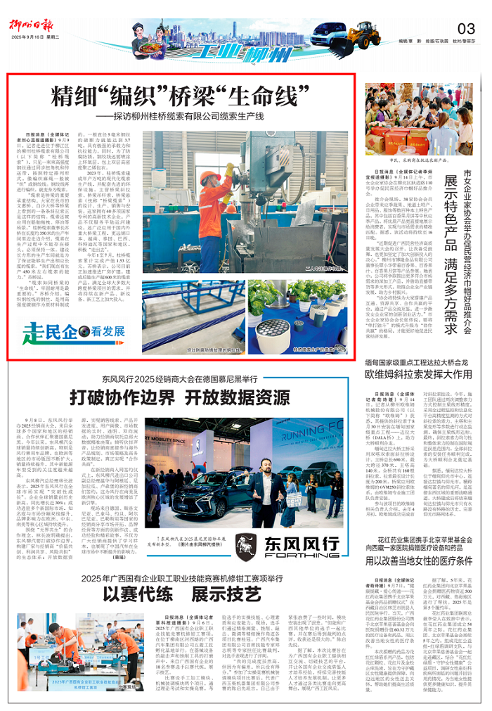 在桂桥缆索的车间,工人们紧盯设备,一根根缆索在多道工序后逐渐成型,最终被大型索盘整齐收卷,等待发往国内外。作为柳江区“走出去”的高新技术企业代表,该公司2023年建成年产万吨的现代化缆索生产线,并配套先进环保设施,产品远销日本、越南、泰国、巴西等国,广泛应用于国内外重大桥梁工程。2024年该公司实现产值2.52亿元,2025年1—7月累计完成产值1.53亿元,稳中有进的态势清晰可见。
