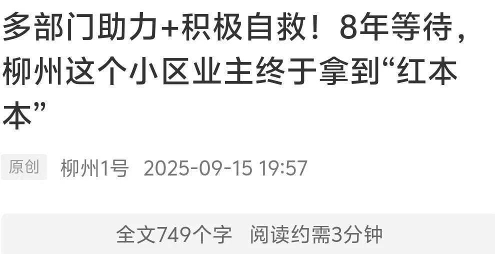 9月13日下午,柳江区柳堡路尚好鑫苑小区沉浸在一片喜悦之中。业主代表韦志平手捧期盼已久的不动产权证,激动不已:“盼了8年,终于领到证了,确实来之不易!”当日,该小区185户业主领到了不动产权证。与此同时,小区还迎来了新物业公司入驻。