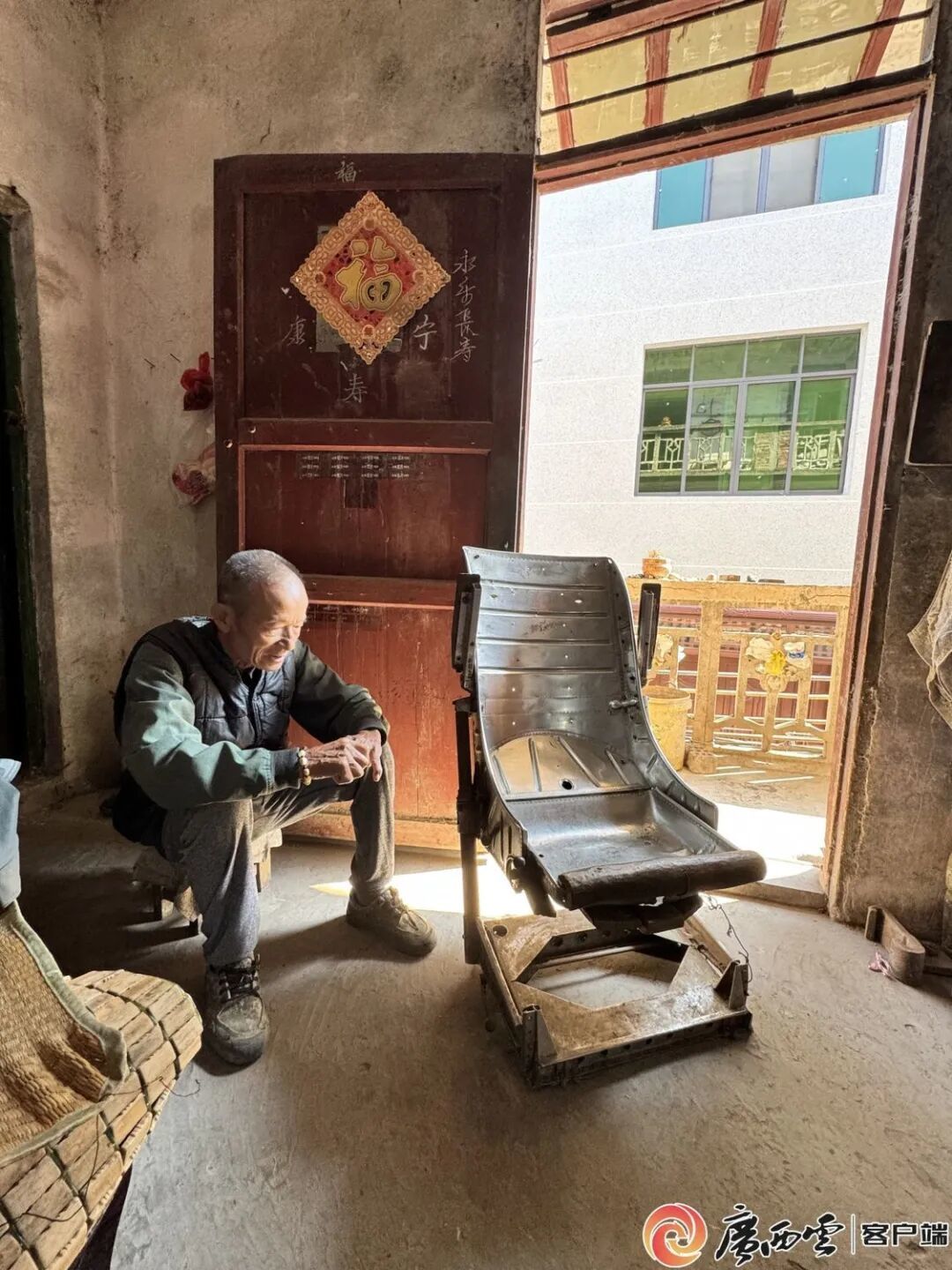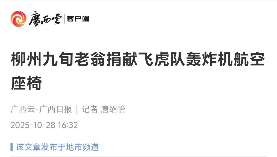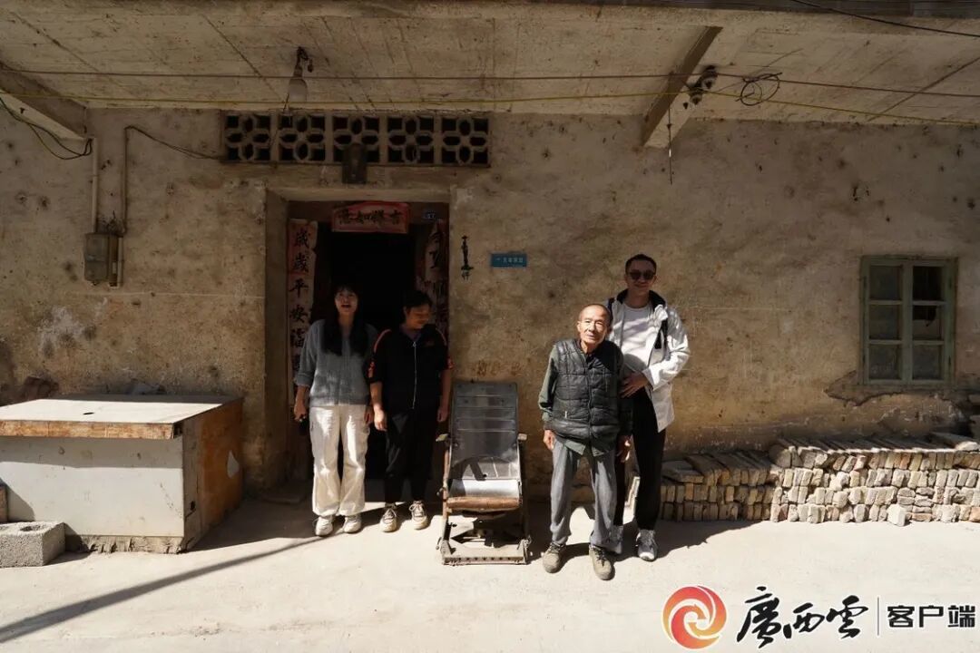 图为位于柳州市柳江区成团镇成团社区二巷37号的韦福林家,韦福林老人与成团镇政府、成团社区、柳州市军事博物园工作人员合影并捐赠飞虎队轰炸机航空座椅。