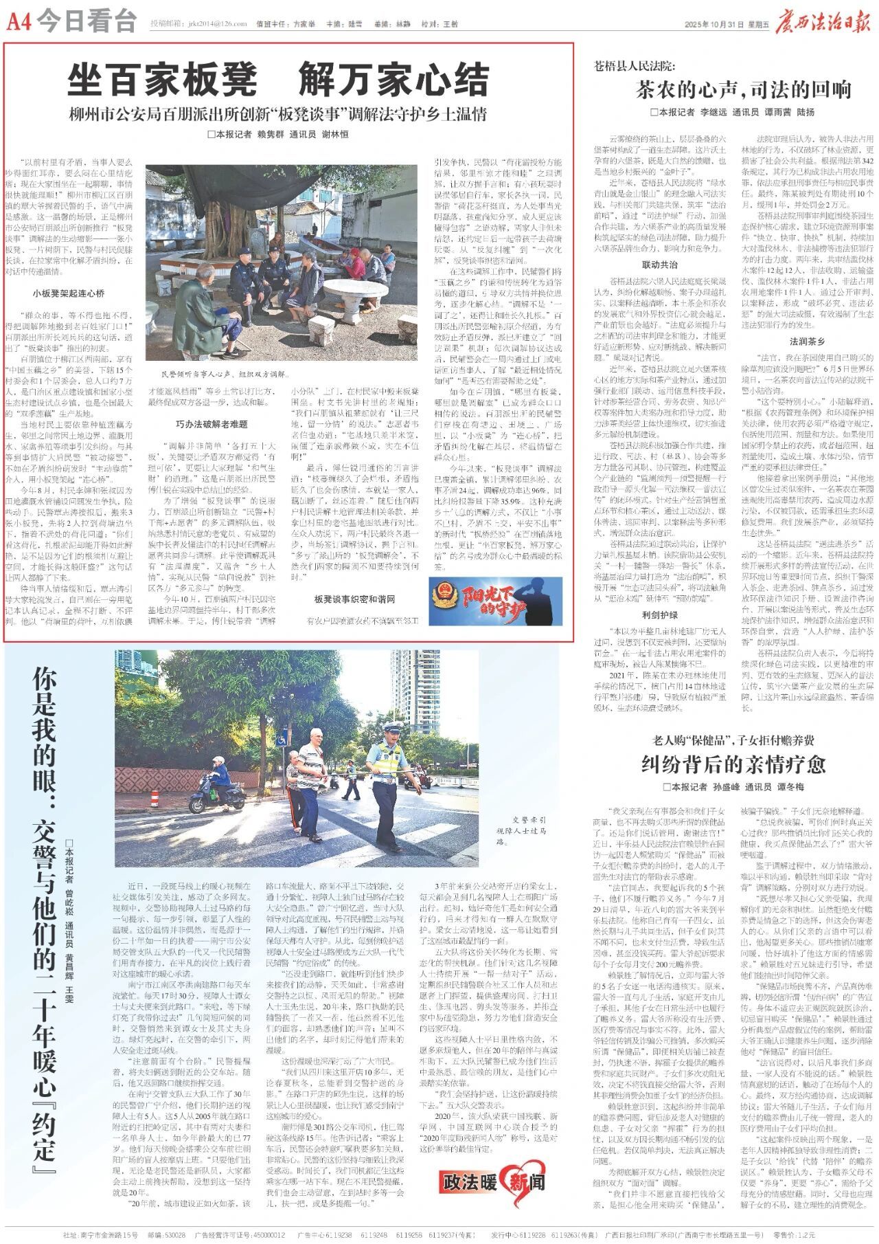 “以前村里有矛盾,当事人要么吵得面红耳赤,要么闷在心里结疙瘩;现在大家围坐在一起聊聊,事情很快就能理顺!”柳州市柳江区百朋镇的覃大爷握着民警的手,语气中满是感激。这一温馨的场景,正是柳州市公安局百朋派出所创新推行“板凳谈事”调解法的生动缩影——一张小板凳、一片树荫下,民警与村民促膝长谈,在拉家常中化解矛盾纠纷,在对话中传递温情。