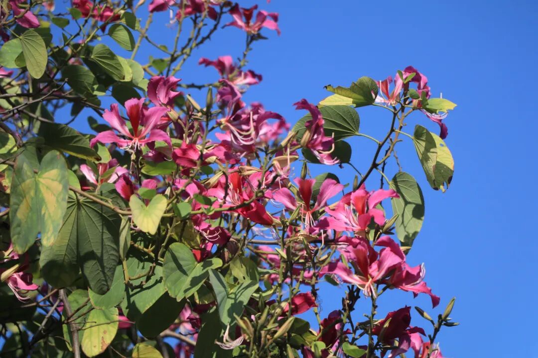 拉堡镇柳西新城小区里,冬景更显温馨。小区主路两旁遍植桂花树,居民陆韦星欣喜地表示:“走到哪儿都是桂花香,整洁街巷配上盛放桂花,幸福感都提升了。”值得一提的是,小区前的柳堡路上,羊蹄甲也正值盛花期,一簇簇紫红色花朵缀满枝头,浓淡相宜的色彩在初冬里愈发明艳,与道路两侧绿植、整洁街景相映成趣,勾勒出一幅雅致灵动的画卷。
