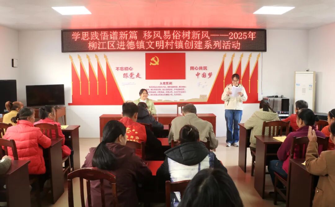 为深入学习贯彻党的二十届四中全会精神,培育和践行社会主义核心价值观,深化柳江区移风易俗“三减四提”工作模式,着力推动文明乡风建设常态长效。近日,“学思践悟谱新篇 移风易俗树新风”——2025年柳江区进德镇文明村镇创建系列活动在进德社区开展,进德社区党员、社区干部及村民代表齐聚一堂,共同参与这场凝聚思想、倡树新风的文明实践活动。