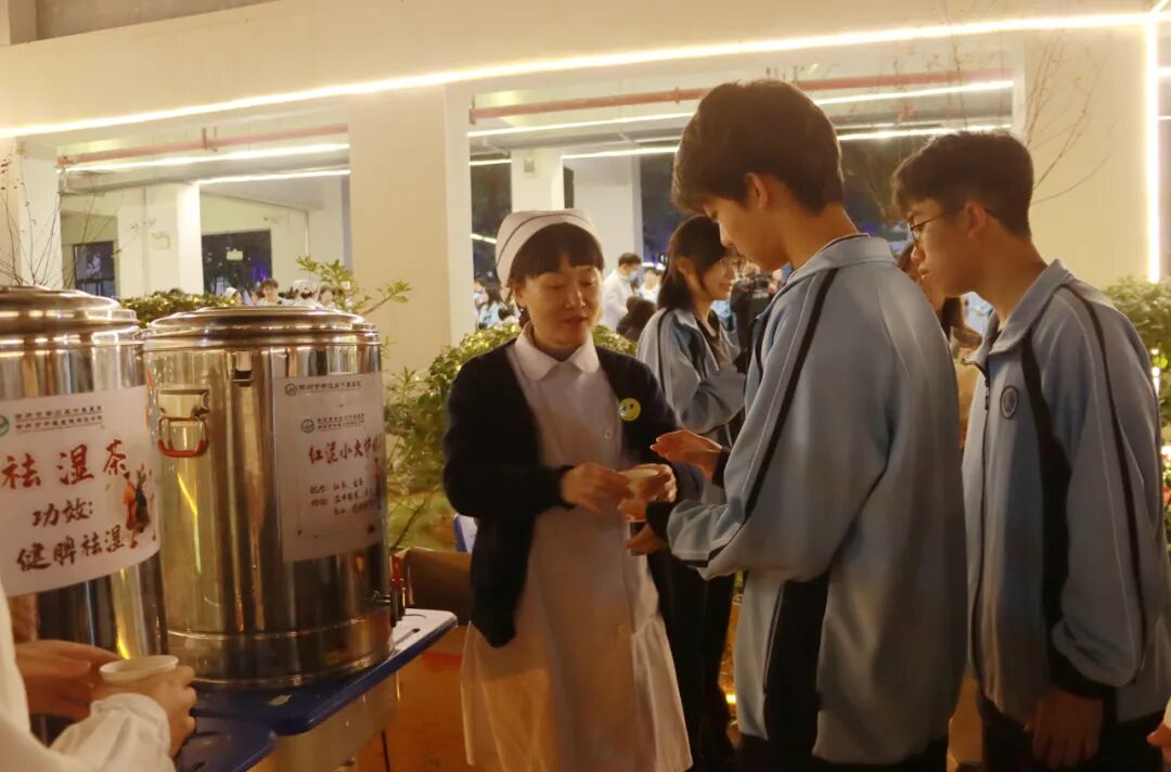 中药代茶饮品尝区茶香袅袅,为师生贴心调配的祛湿茶与红泥小火炉养生奶茶免费供大家品饮。医护人员耐心询问每个人的身体状况,根据体质精准推荐适宜的茶饮,让大家在氤氲香气中,既品味草本芬芳,也切身领略中医辨证的精妙。“以前常喝甜饮料,但今天这款养生奶茶姜味浓郁、口感温和,特别好喝。”学生韦艳丽品尝后赞不绝口。