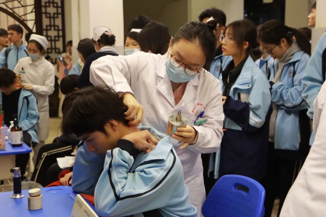 活动现场人头攒动,其中中医特色治疗体验区尤为引人注目,成为师生争相“打卡”的热门区域。柳江区中医医院的医护团队现场提供针灸、扶阳罐、耳穴压豆、砭石温灸等特色理疗服务,精湛的手法与细致的讲解吸引众人驻足。“医生的推拿非常专业,有效缓解我因长期久坐引发的肩颈酸痛,这次体验让我真切感受到中医的博大精深,也更想深入了解它。”刚体验完推拿的学生谢欣芮兴奋地分享道。医护人员还针对青少年常见的用眼过度、颈椎疲劳等问题,现场传授穴位按摩技巧,让大家在互动中领略中医养生的智慧。