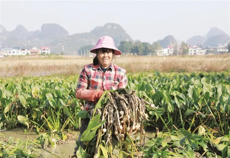 据了解,百朋镇依托得天独厚的土壤与气候条件,大力发展慈姑种植,今年种植面积1.1万亩。目前,百朋镇慈姑每斤批发价约2元,主要销往柳州海吉星农产品批发市场,供应本地及周边市场。