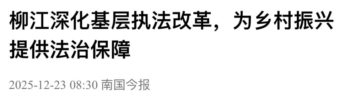 12月22日,柳州市柳江区召开新闻发布会,系统介绍乡镇综合行政执法规范化建设成果。近年来,柳江区通过“两方案、两清单、一意见、一指引”等制度设计,构建起区镇联动、权责清晰的基层执法体系,探索出一条具有地方特色的执法规范化路径。