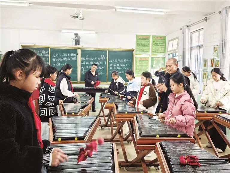 教室一侧,柳江石琴演奏和制作技艺非物质文化遗产代表性传承人韦彬林、韦明章正静静聆听。他们不时走上前,轻声指导孩子们演奏石琴。孩子们正在演奏的曲目《刘三姐》,是韦彬林根据石琴高、中、低三声部特点精心改编而成。“石琴是柳江珍贵的文化瑰宝。能让非遗技艺代代相传,是我的心愿。”看着孩子们认真演奏的模样,韦彬林的眼中满是欣慰与期待。