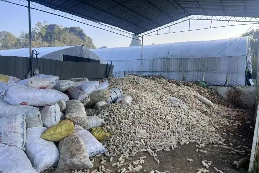 清晨薄雾尚未散去,柳江区里高镇的木耳种植基地已是一片忙碌。“轰隆隆”的机器声中,粉碎机正将成捆桑秆、玉米棒吞入又吐出,金黄碎屑如流水般顺着传送带涌向菌棒加工车间。空气中弥漫着秸秆特有的草木香,工人们动作利落地装袋、封口,一排排菌棒整齐码放,静待一场从“废料”到“金耳”的蜕变。