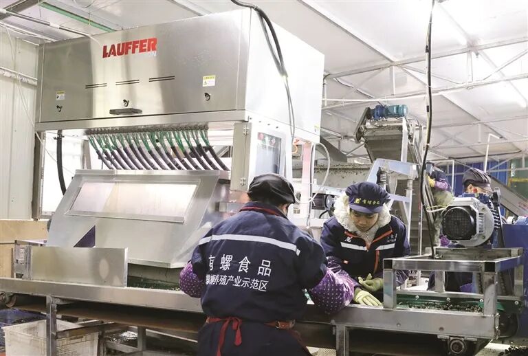 走进选螺生产车间,只见一台AI智能选螺机正平稳运行,高速摄像头精准扫描、快速识别,通过这条智能化流水线,可精准按照大小、形态、色泽自动归类。“过去全靠手工,效率低、眼睛累,品控也不稳定。”现场管理员姚文娟介绍,“自从引进这套AI系统,分拣效率提升10倍,人力成本大幅下降,品控稳定性显著提高,订单也更有保障。”