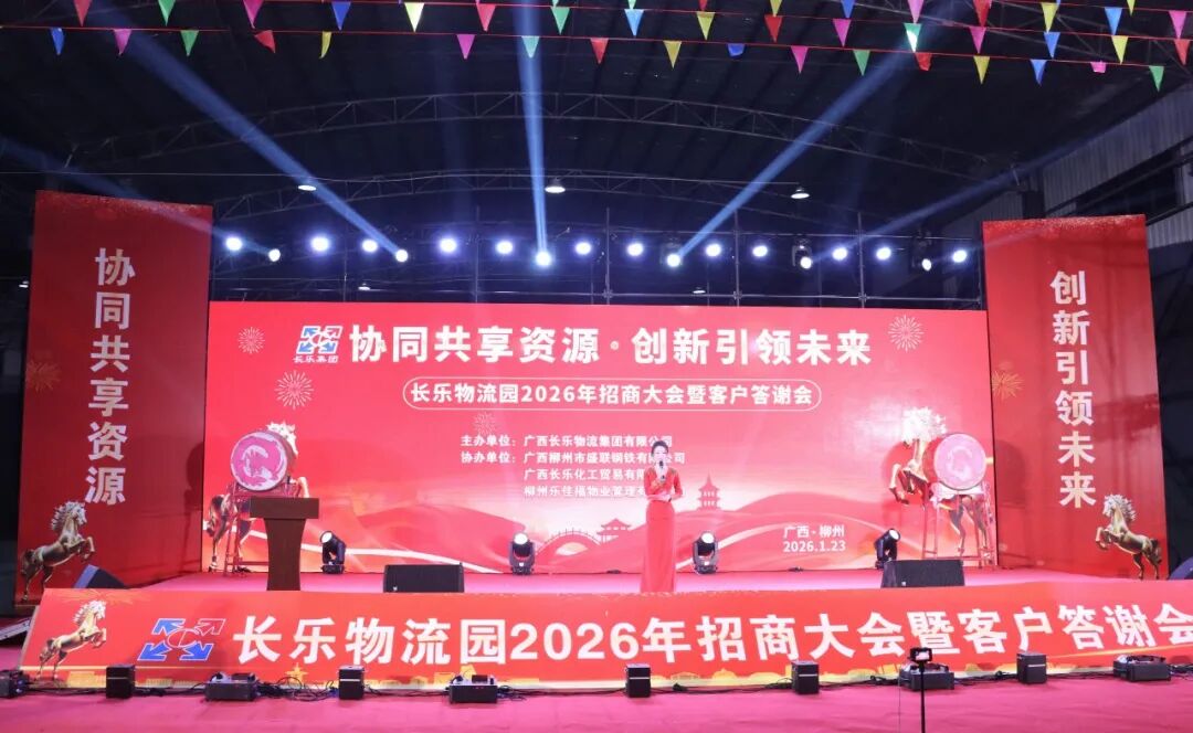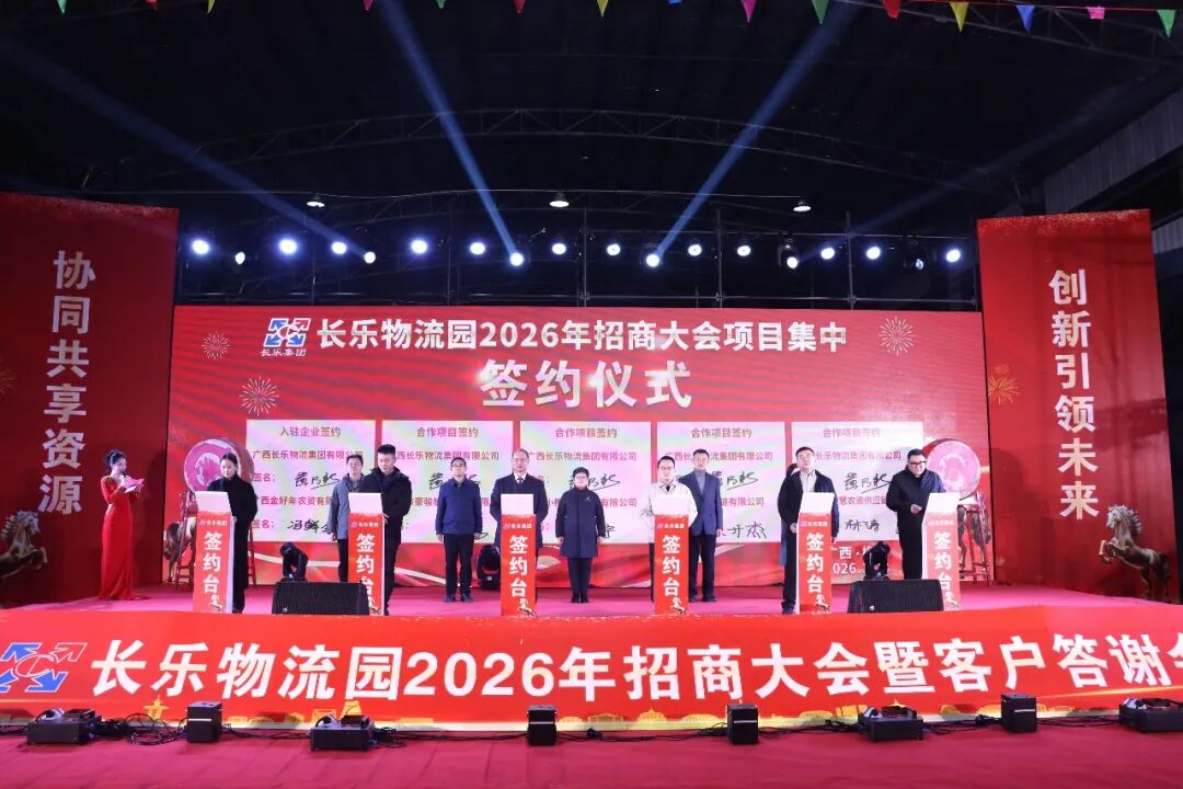 1月23日,长乐物流园2026年招商大会暨客户答谢会在长乐物流园举行。区委书记玉秋静,区委副书记张扬,区委常委、常务副区长姚芳,副区长覃春前、韦静参加大会。