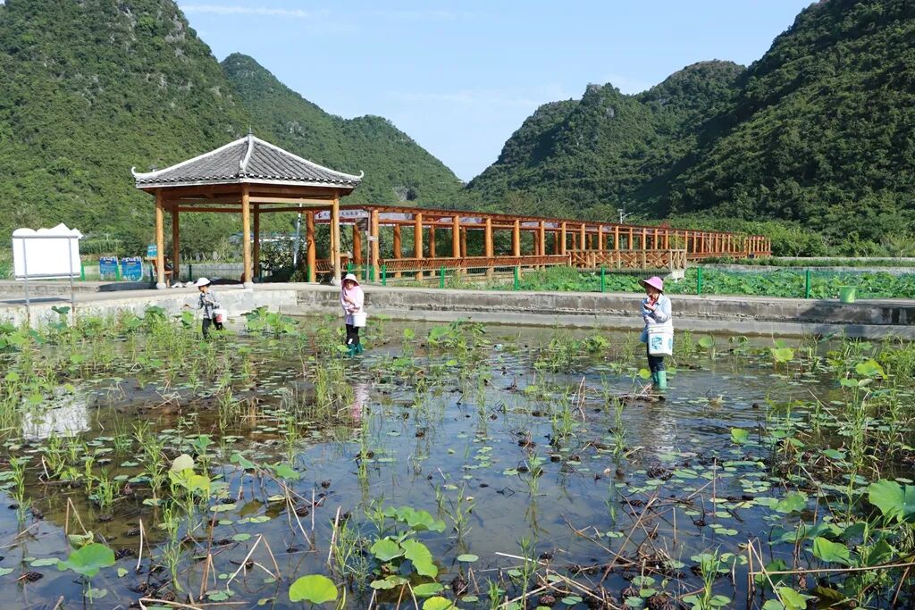 工人们在柳江区螺蛳养殖产业示范区抛撒螺苗。