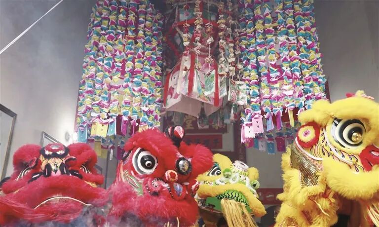现场,村民取下旧花灯、争抢纸花祈福迎新,随后点亮新花灯高悬梁上,众人争相抚摸新花灯,祈求福气绵延。一盏盏花灯寄托着客家儿女对新一年的美好期盼。