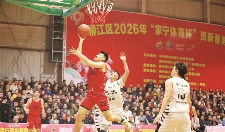 3月1日晚,柳江区2026年“家宁体育杯”贺新春男子篮球赛完赛。穿山镇代表队以84比61战胜成团镇代表队夺得冠军,进德镇英菲特代表队获季军。